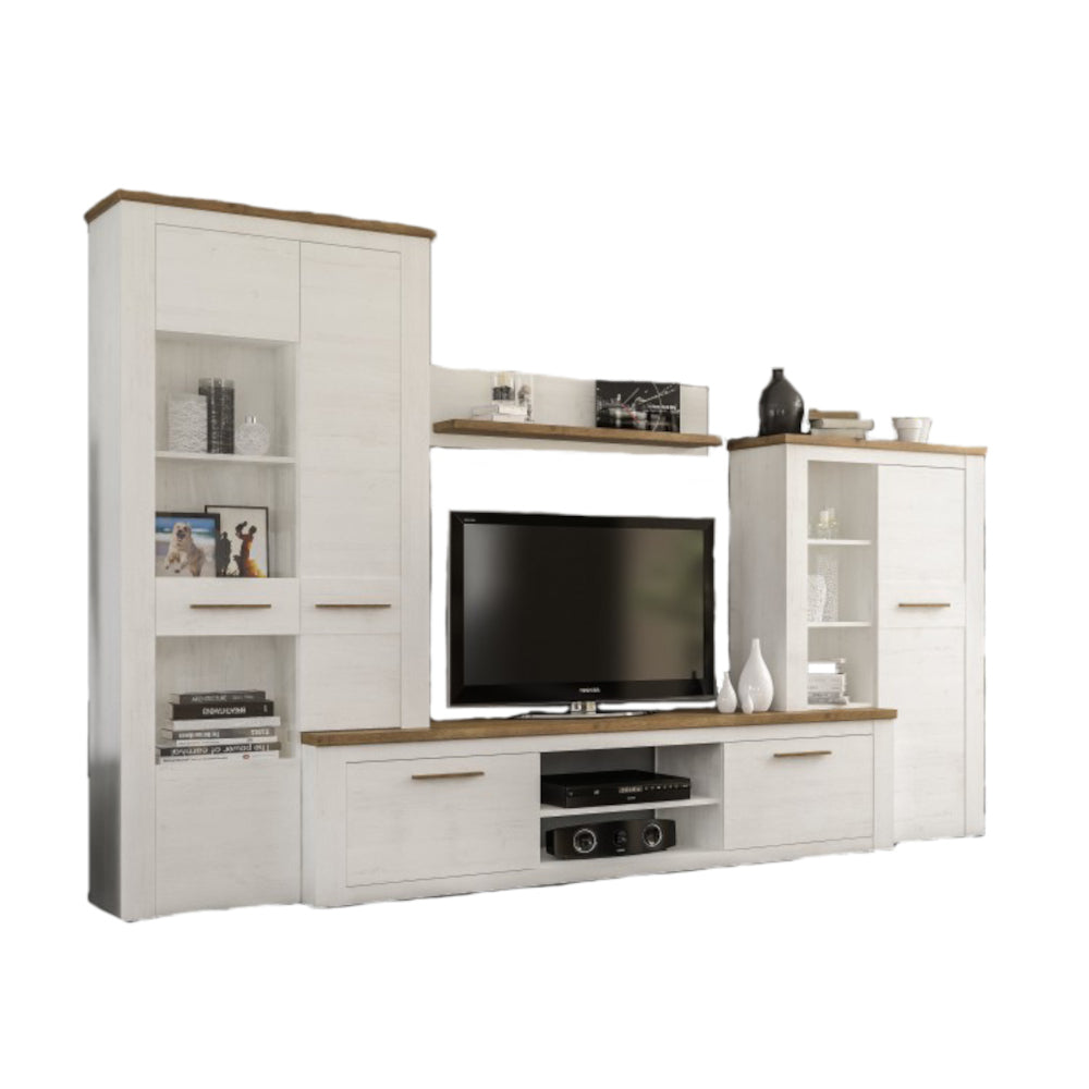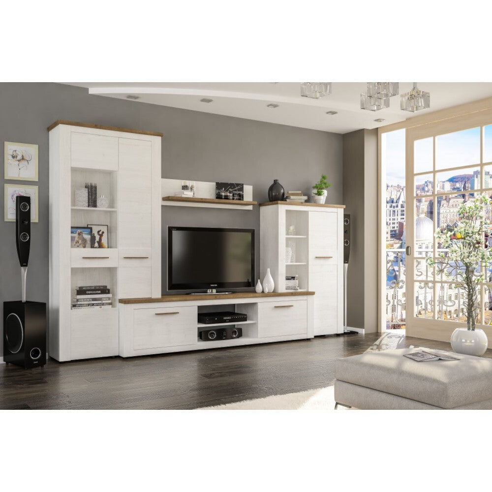 Obývacia stena DennyAk máte záujem o elegantný štýl v kombinácii borovice andersen a hnedej farby, potom je pre vás obývacia stena Denny tá pravá. Súprava sa skladá z televízneho stolíka, dvoch skriniek a závesnej police. Stena ponúka dostatok úložného priestoru, kam môžete umiestniť všetky dôležité veci a mať ich hneď po ruke. Nájdete tu aj úložný priestor, kde si môžete vystaviť rodinné fotografie, knihy, obľúbené dekorácie alebo televízor. Dvierka majú plastové úchyty v zlatom vyhotovení. Stena je vyrobená z kvalitnej drevovláknitej dosky, ktorá nám poskytuje veľkú odolnosť a možnosť šetrného umývania vlhkou handričkou. Obývacia stena sa vďaka svojej šírke hodí skôr do priestrannejších miestností, ale vďaka svetlému dekoru ju ľahko zladíte s tmavšími a odvážnejšími farebnými motívmi.