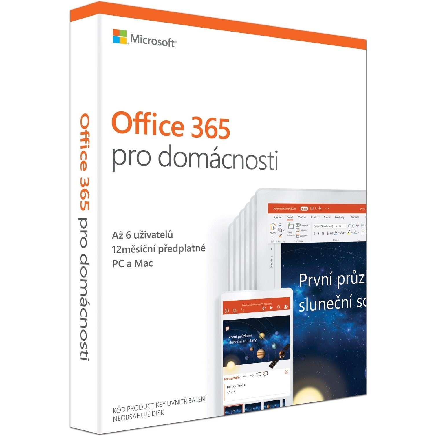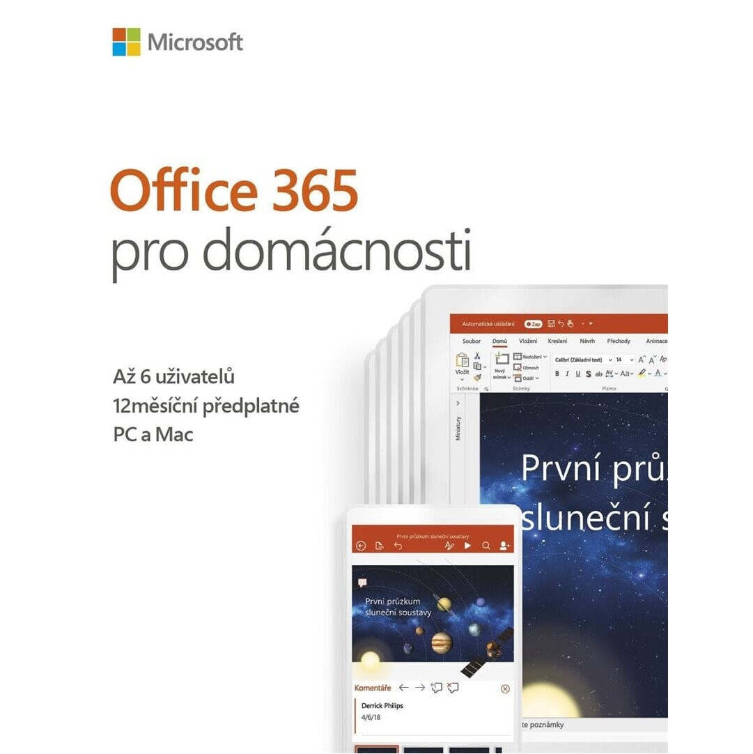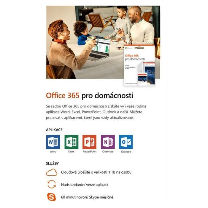 Vďaka sade známych kancelárskych aplikácií od Microsoftu získa vaša domácnosť a jej členovia prístup k ľahkej tvorbe dokumentov, tabuliek alebo prezentácií. Až šesť užívateľov bude môcť po dobu jedného roka využívať programy Word, Excel, PowerPoint, OneNote a Outlook a navyše získate 1 TB v cloudovom úložisku OneDrive.