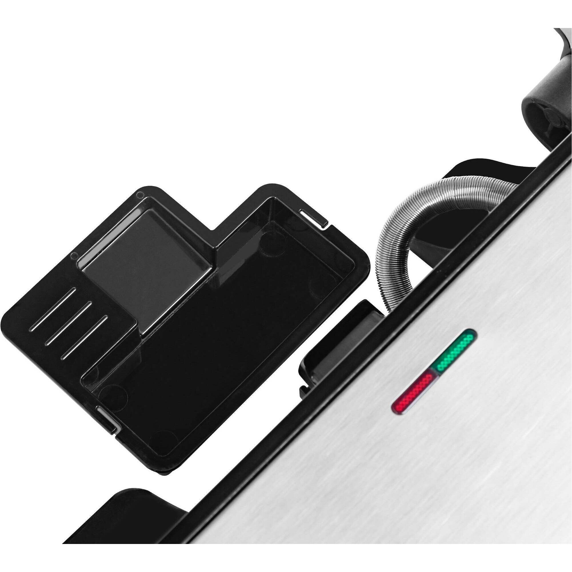 Jednoduchá obsluhaPrístroj stačí zapnúť, chvíľku počkať, až sa rozsvieti modrá kontrolka, položiť naň pripravenú kŕmi a zavrieť. Grilovacie dosky o veľkosti 155 x 250 mm potom ľahko uzamknete a madlo je tepelne izolované, takže sa nepopálite. Pokiaľ chcete prístroj využívať ako gril, môžete ho rozložiť v uhle 180 stupňov a využívať obe plochy. |