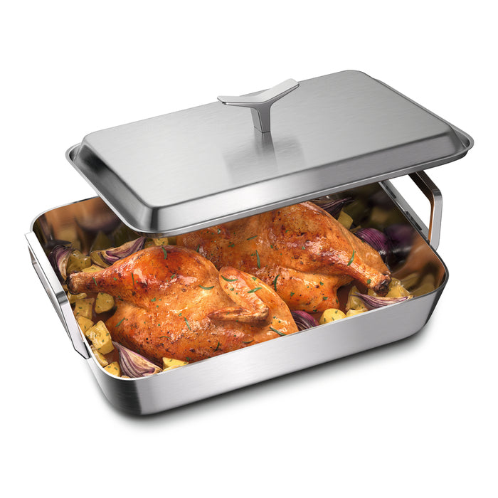 Pekáč s víkemPomocí restovacího hrnce uvaříte vše od dušených jídel po restovaná masa, zeleninu a drůbež. Osmahněte nebo předvařte na varné desce a poté váš pokrm jednoduše dokončete v troubě. Všechny bohaté chutě uchováte uvnitř restovacího hrnce a vždy dosáhnete šťavnatého a měkkého výsledku.