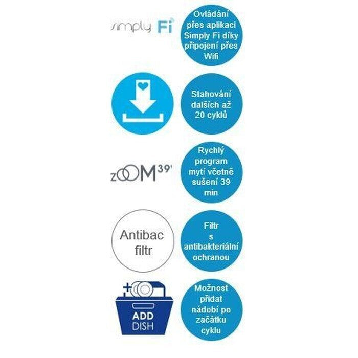 Moderné technológieUmývačka ide s dobou, možnosť prepojenia cez Wi-Fi či Bluetooth rozširuje škálu jej použitia. Stiahnite si aplikáciu Simply-Fi do vášho smartphonu a budete schopní získať informácie o vašej spotrebe vody, energie, zásobe soli a leštidla. |