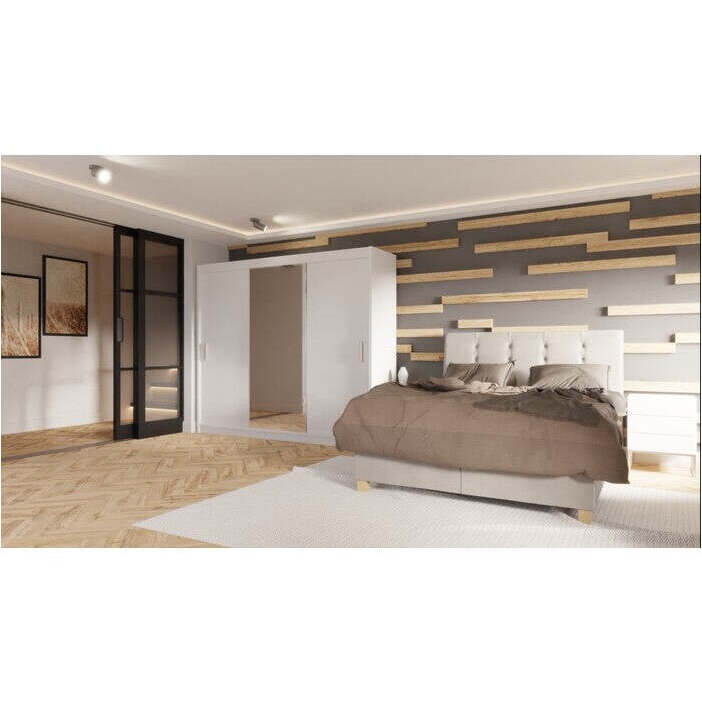 Boxspring Charles - garancia pohodlia a elegancieBoxspringová posteľ Charles sa stane dominantou každej spálne. Zaujme vás svojím moderným dizajnom, poskytovaným pohodlím a množstvom praktických funkcií. Zvýšené lôžko zostavená z dvoch vrstiev matracov a horného topperu je typickým znakom postelí s tzv. systémom boxspring, tiež označovaný ako kontinentálny. Kontinentálna posteľ je veľmi komfortná a priestranná a postará sa o váš pokojný spánok. Plocha lôžka s rozmermi 180x200 cm poskytuje dostatok priestoru na odpočinok. Dominantou postele je čalúnené 124 cm vysoké čelo, ktoré je, rovnako ako korpus postele, čalúnené príjemnou látkou Salvador pripomínajúcou zamat. Celkový dizajn potom dopĺňajú lakované nožičky z masívneho dreva s výškou 10 cm, čo je dostatočný priestor pre väčšinu robotických vysávačov. Výška plochy na spanie je 73 cm, bude sa vám teda z nej lepšie vstávať. Vďaka neutrálnej béžovej farbe sa posteľ Charles hodí do takmer všetkých bytových interiérov. Posteľ je možné doplniť taburetom, ktorý vám pridá ďalší praktický úložný priestor. Upozornenie: Vyobrazené vankúše a prikrývka nie sú súčasťou postele.