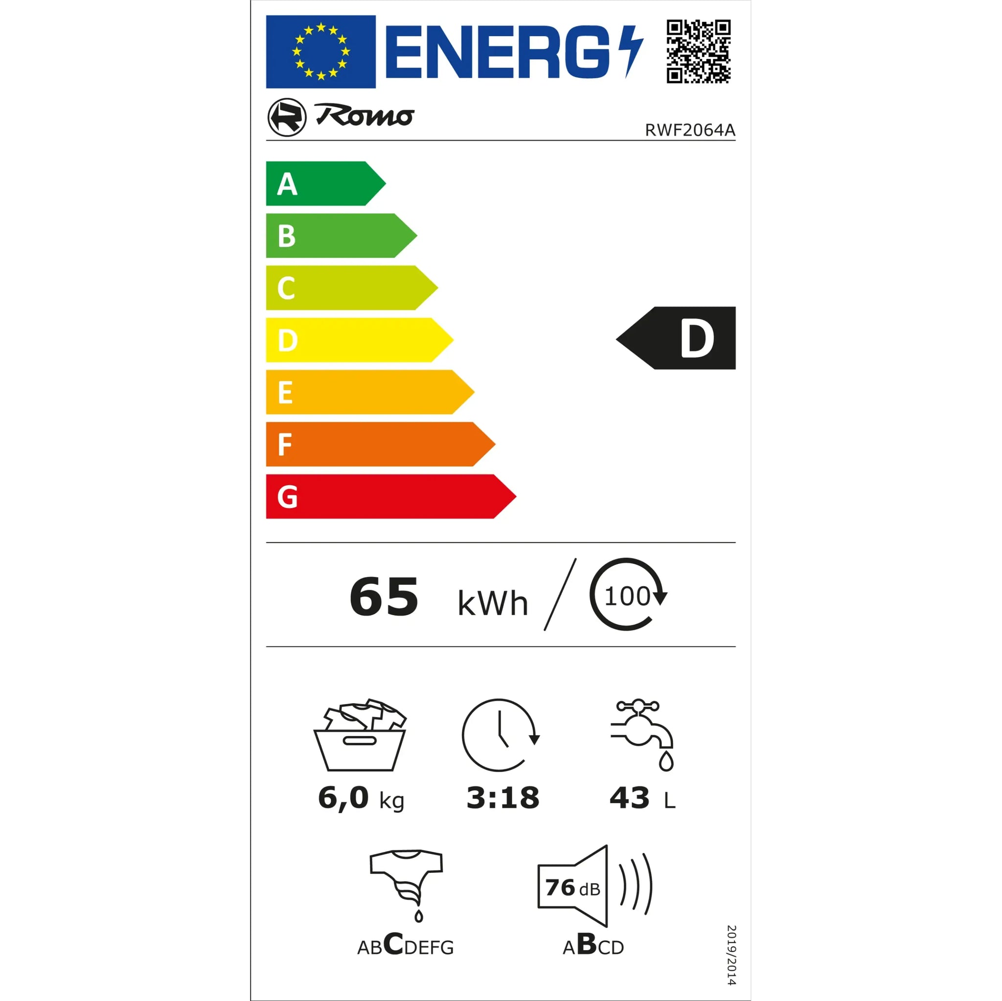 Voľne stojaca vopred plnená práčka Romo RWF2064A sa stane nepostrádateľnou súčasťou vašej domácnosti. Kapacita bubna pojme až 6 kg bielizne a maximálna rýchlosť odstreďovania siaha k 1000 otáčkam za minútu. Vďaka efektívnej hospodárnosti spočívajúcej v nízkej spotrebe elektriny a vody si vyslúžila zaradenie do energetickej triedy D. |