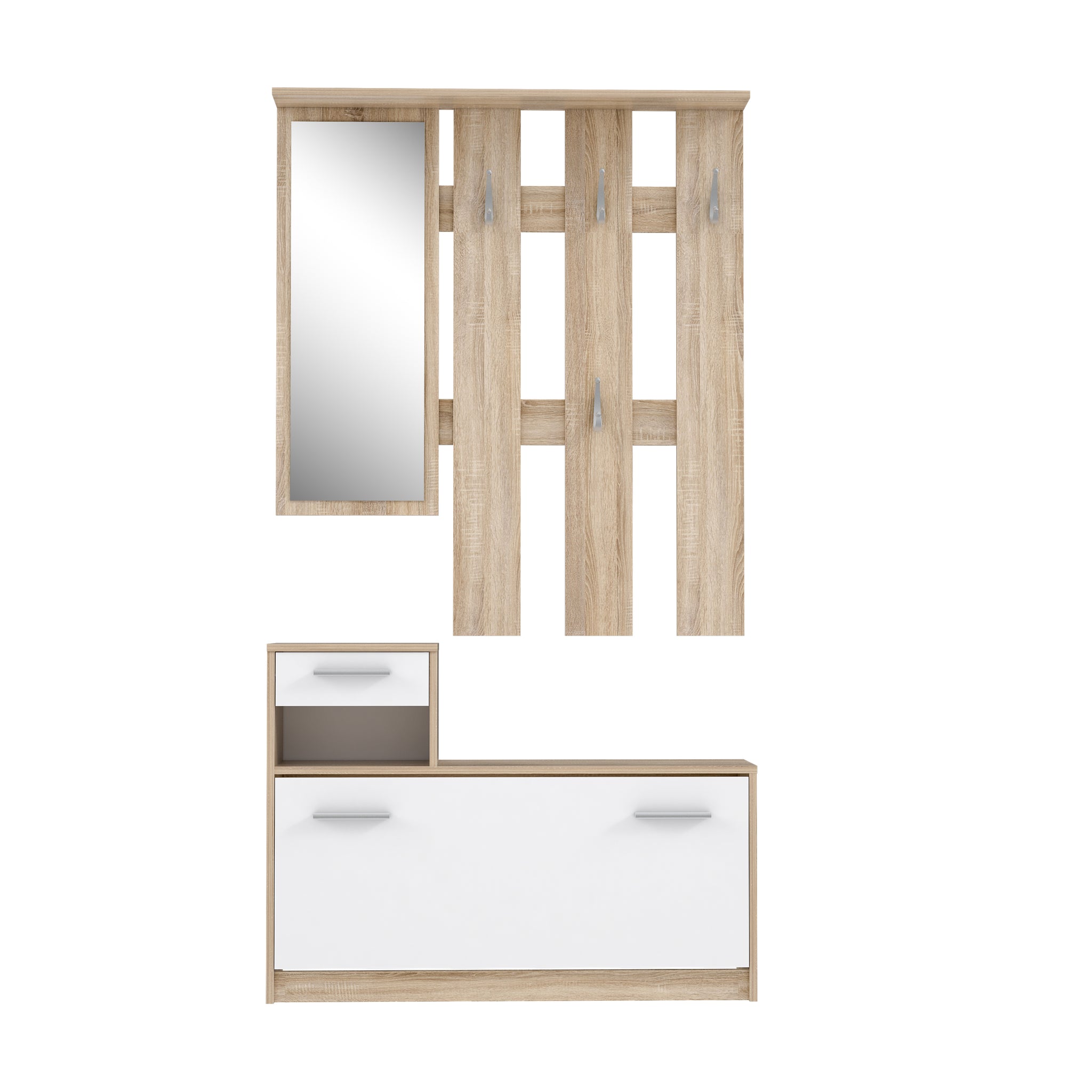 Praktická predsieňová súprava Akira01Predsieňová zostava Akira01 je moderné a zároveň veľmi praktické riešenie pre vašu predsieň alebo iný vstupný interiér. Celá súprava sa skladá z priestrannej komody s pridanými policami, botníka, vešiaka, zrkadla a menšej police na vaše dekorácie alebo na uloženie drobností, ako sú napríklad kľúče. V hornej časti vešiakového panelu sa nachádza aj praktická polička, ktorá je ideálna na odkladanie vecí, ktoré nechcete zabudnúť doma, napríklad dáždnika alebo klobúka. Po zostavení tvorí predsieňová zostava jednu pevnú stenu, čím šetrí miesto vo vašej domácnosti bez toho, aby ste museli obmedzovať úložné a odkladacie priestory, ktoré ponúka. Na výrobu boli použité vysokokvalitné drevotrieskové dosky, ktoré sú veľmi nenáročné na údržbu, spolu s ABS hranami, ktoré zostave zabezpečujú veľkú odolnosť a životnosť. Vďaka svojmu dizajnu a zvoleným farbám sa táto zostava ľahko stane súčasťou každého interiéru.