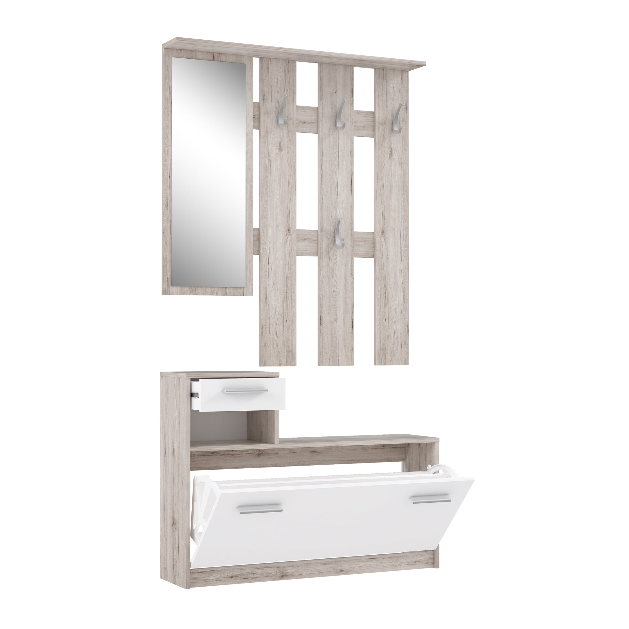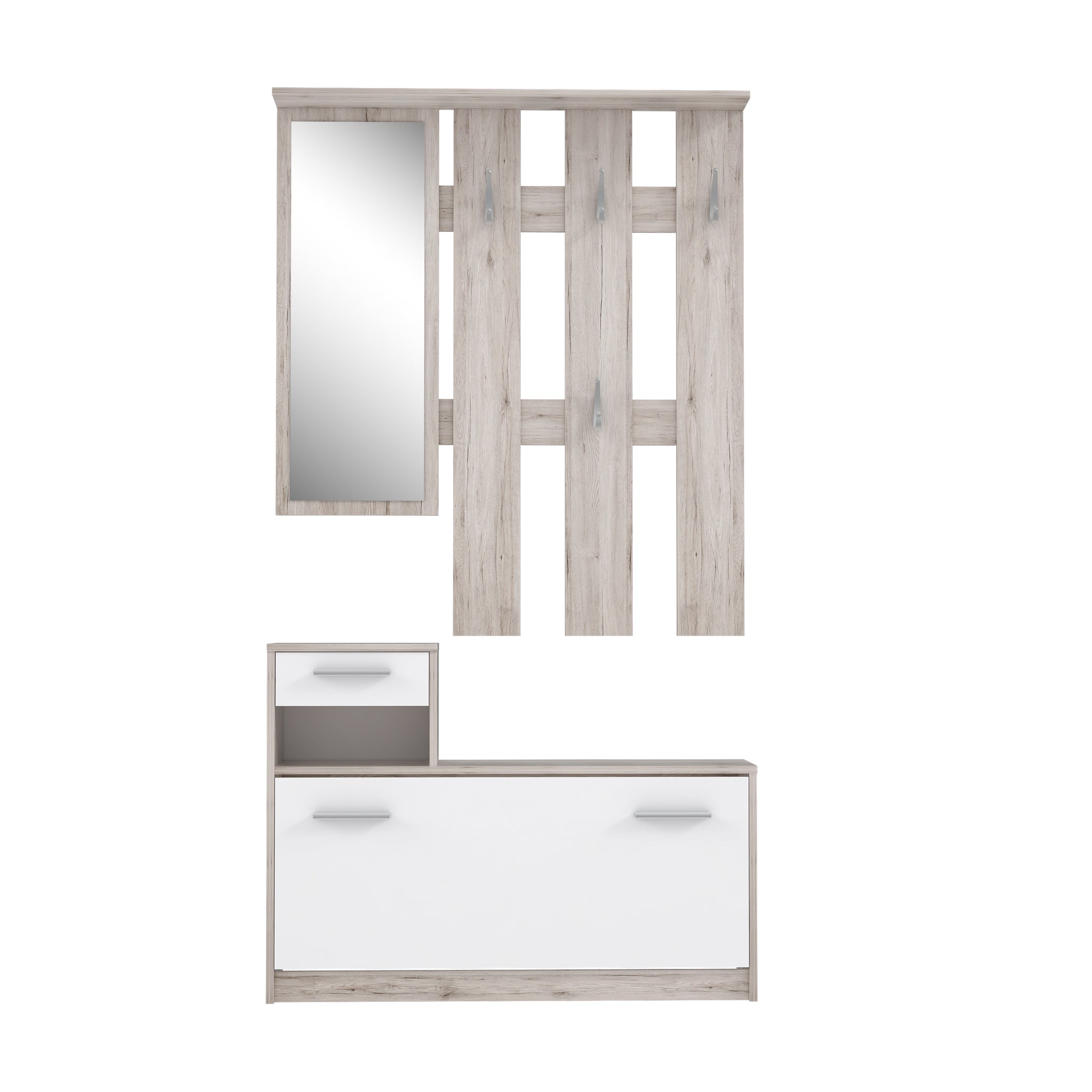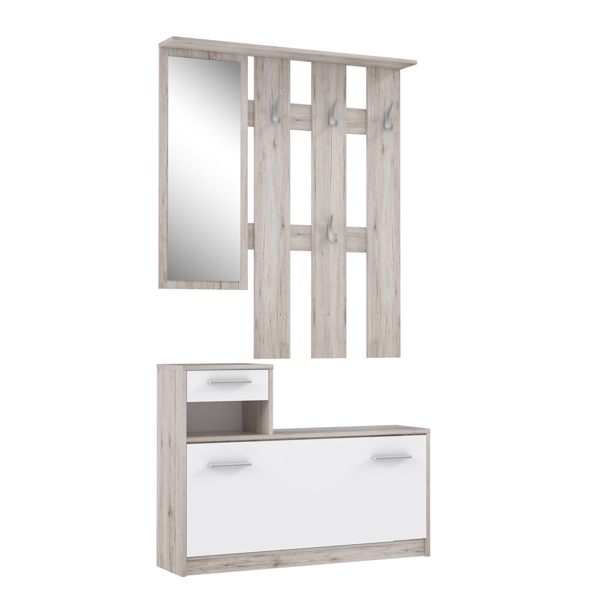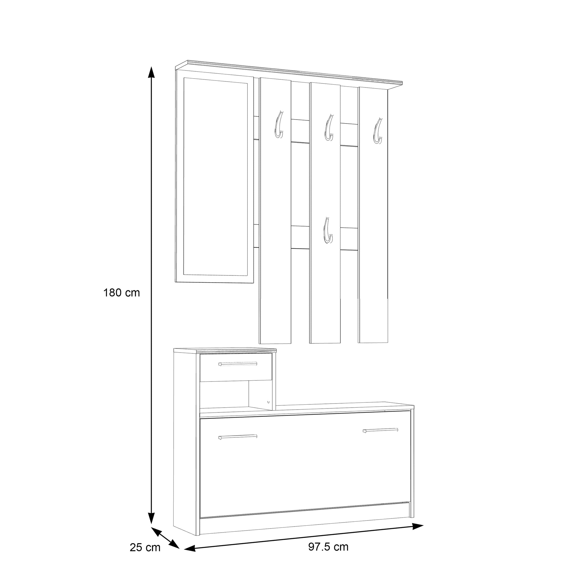Praktická predsieňová súprava Akira02Predsieňová zostava Akira02 je moderné a zároveň veľmi praktické riešenie pre vašu predsieň alebo iný vstupný interiér. Celá súprava sa skladá z priestrannej komody s pridanými policami, botníka, vešiaka, zrkadla a menšej police na vaše dekorácie alebo na uloženie drobností, ako sú napríklad kľúče. V hornej časti vešiakového panelu sa nachádza aj praktická polička, ktorá je ideálna na odkladanie vecí, ktoré nechcete zabudnúť doma, napríklad dáždnika alebo klobúka. Po zostavení tvorí predsieňová zostava jednu pevnú stenu, čím šetrí miesto vo vašej domácnosti bez toho, aby ste museli obmedzovať úložné a odkladacie priestory, ktoré ponúka. Na výrobu boli použité vysokokvalitné drevotrieskové dosky, ktoré sú veľmi nenáročné na údržbu, spolu s ABS hranami, ktoré zostave zabezpečujú veľkú odolnosť a životnosť. Vďaka svojmu dizajnu a zvoleným farbám sa táto zostava ľahko stane súčasťou každého interiéru.