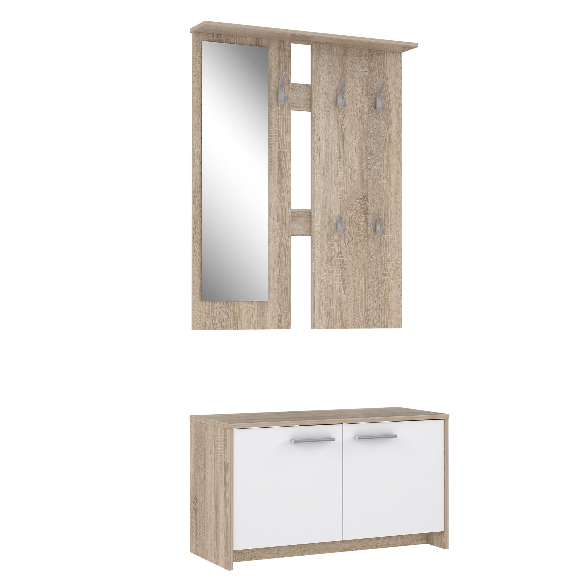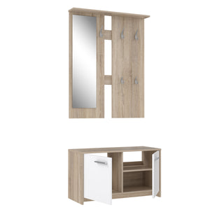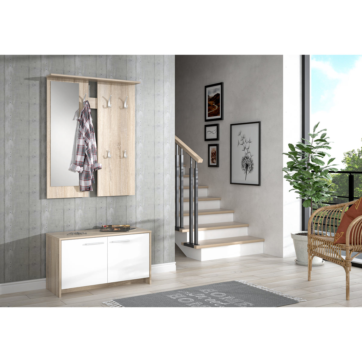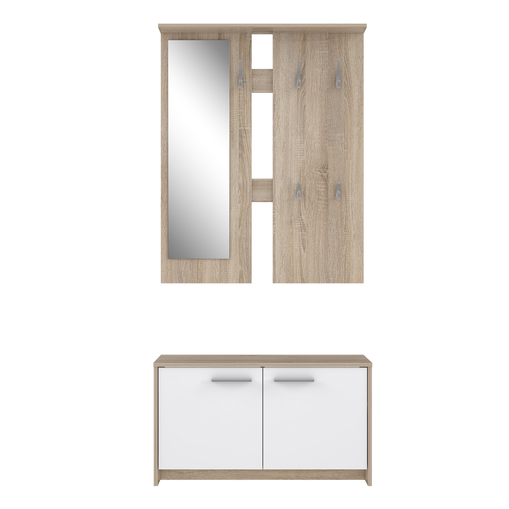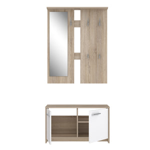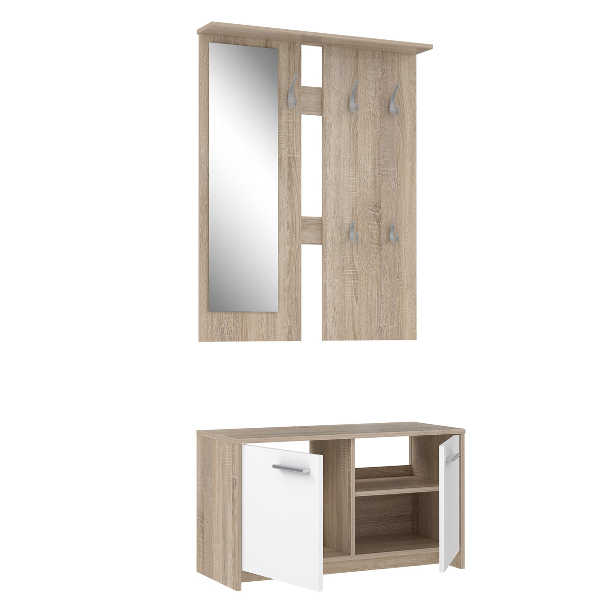 Popri svojej praktickosti zaujme predsieňový set Foxtrot aj svojim štýlovým vzhľadom. Set si získa pozornosť moderným jednoduchým prevedením v podobe spojenia prírodného dekoru duba sonoma a bielej farby, vďaka čomu dokonale zapadne do väčšiny interiérov. Zrkadlo potom nielenže opticky zväčšuje priestor v predsieni, ale hlavne pomáha s výberom vhodného oblečenia. Set je vyrobený z laminovanej drevotrieskovej dosky (LDTD), ktorá zaisťuje pevnosť, stabilitu a dlhú životnosť. Tento materiál má zvýšenú odolnosť voči oderu a ľahko sa udržuje, pričom na čistenie stačí použiť navlhčenú handričku.