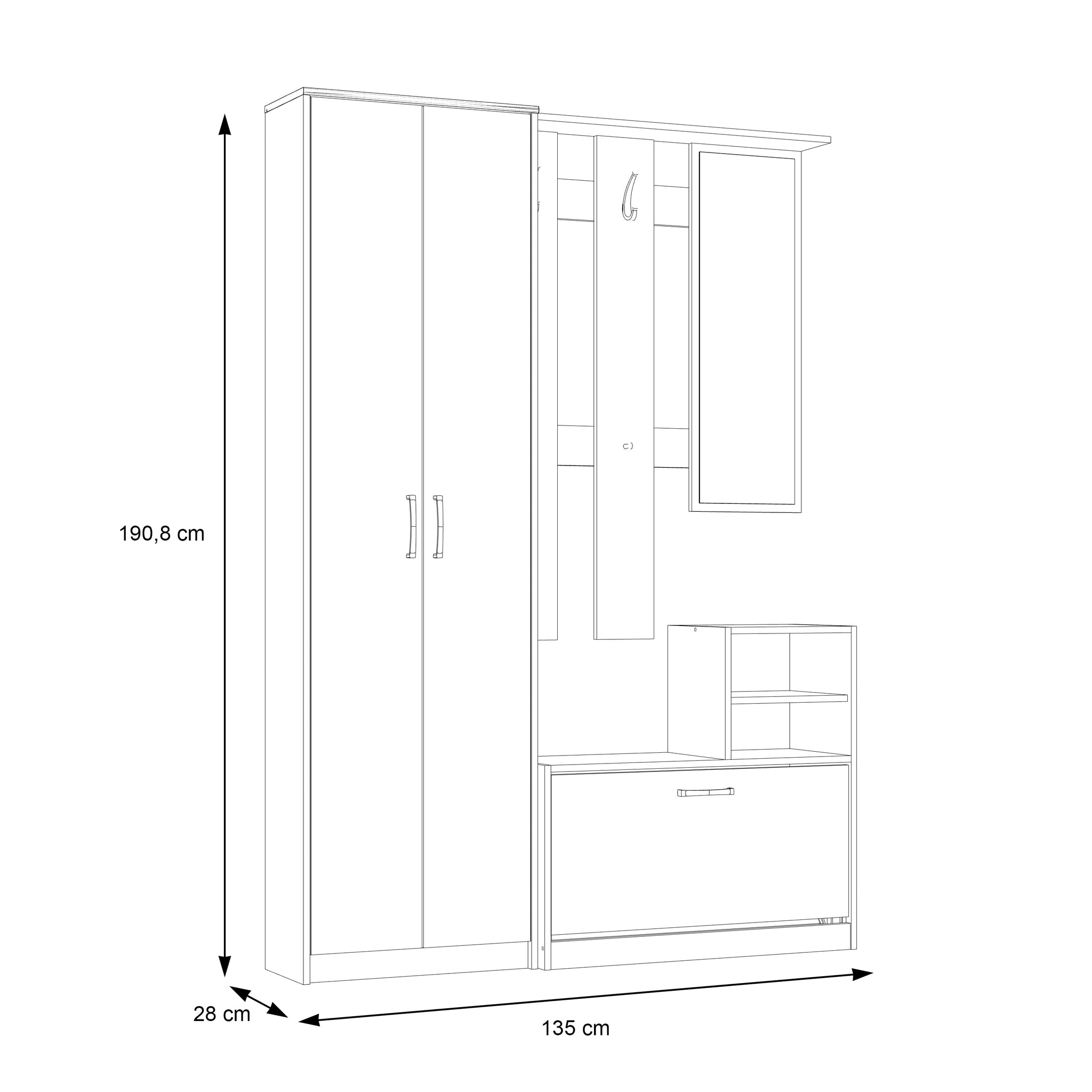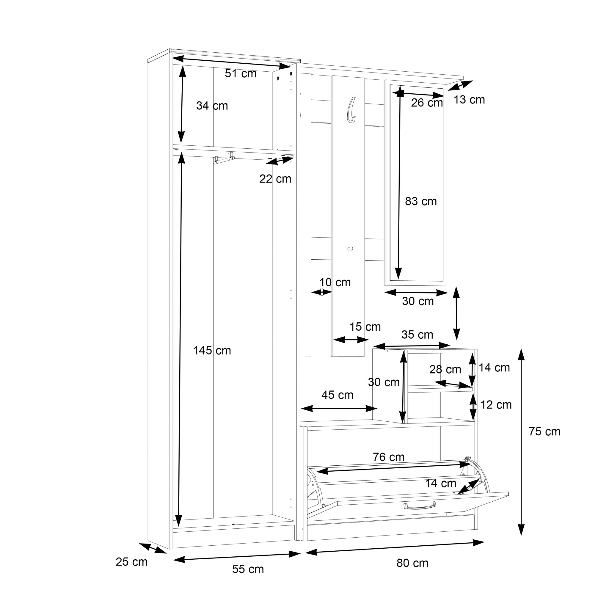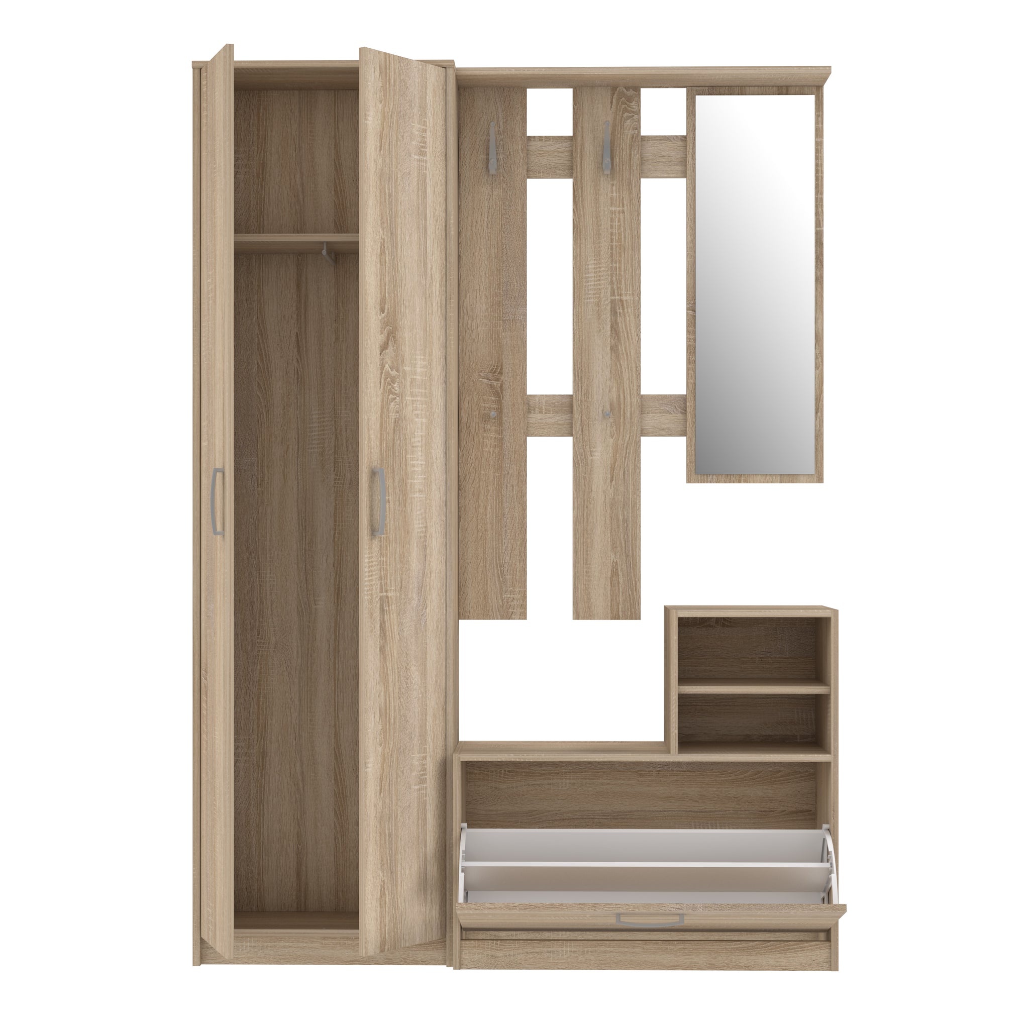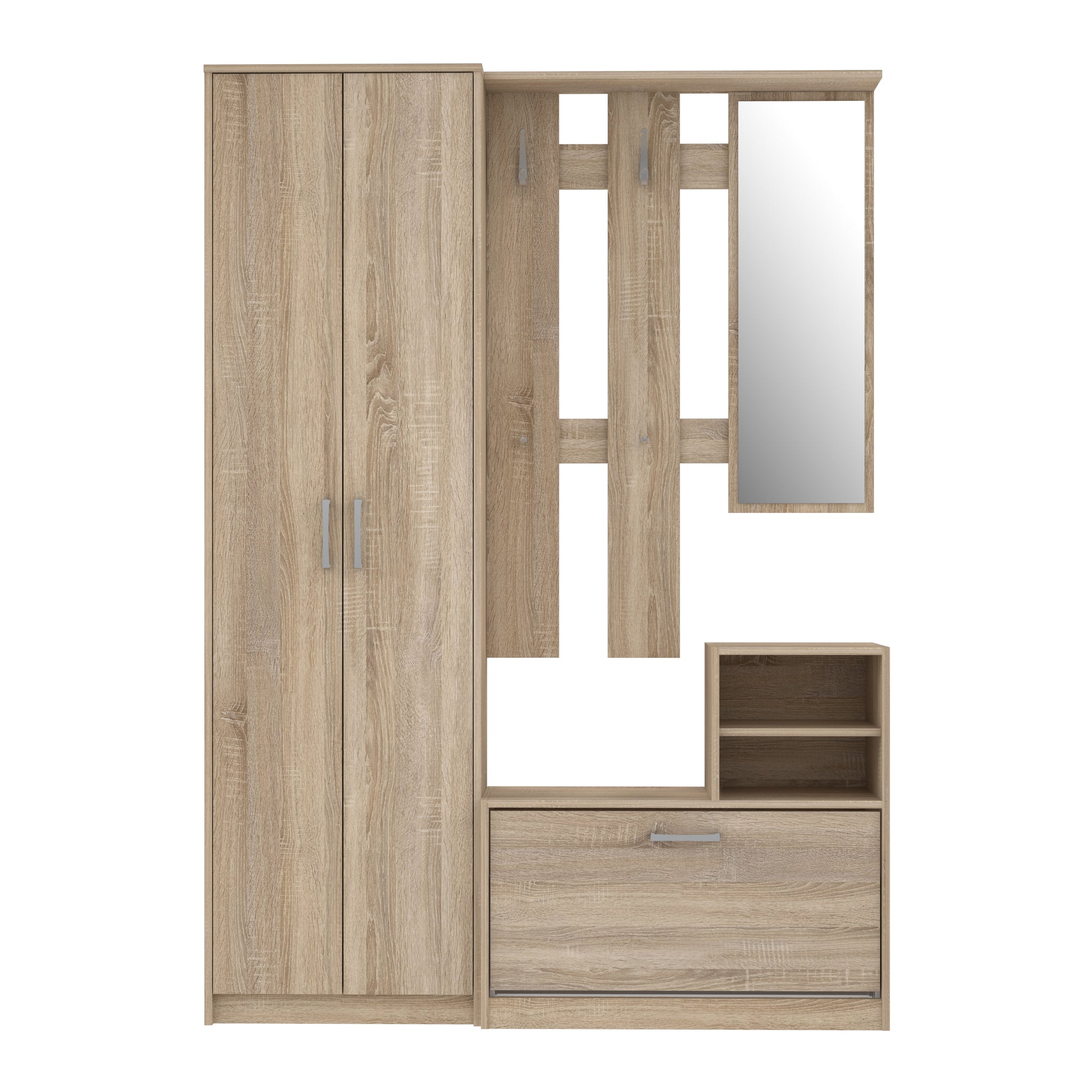 Praktická predsieňová súprava Nobo02Predsieňová zostava Nobo02 je moderné a zároveň veľmi praktické riešenie pre vašu predsieň alebo iný vstupný interiér. Celá súprava sa skladá z priestrannej komody s pridanými policami, botníka, vešiaka, šatníkovej skrine, zrkadla a menšej police na vaše dekorácie alebo na uloženie drobností, ako sú napríklad kľúče. V hornej časti vešiakového panelu sa nachádza aj praktická polička, ktorá je ideálna na odkladanie vecí, ktoré nechcete zabudnúť doma, napríklad dáždnika alebo klobúka. Po zostavení tvorí predsieňová zostava jednu pevnú stenu, čím šetrí miesto vo vašej domácnosti bez toho, aby ste museli obmedzovať úložné a odkladacie priestory, ktoré ponúka. Na výrobu bola použitá vysokokvalitná drevotrieska, ktorá je veľmi nenáročná na údržbu a zaručuje veľkú odolnosť a dlhú životnosť. Vďaka svojmu dizajnu a zvoleným farbám sa táto súprava ľahko stane súčasťou každého interiéru.