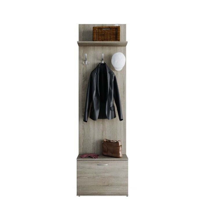Predsieňová zostava LancePredsieňová stena Lanke je veľmi praktický pomocník a výborne zapadne do vašej predsiene či vstupného priestoru. Nábytok do predsiene sa skladá z botníka, troch vešiakov a hornej police. Na výrobu bola použitá kvalitná drevotrieska v dekore sonoma. Pôsobí veľmi moderne a vhodne doplní váš interiér. Predsieňový nábytok sa veľmi ľahko udržuje, na čistenie stačí použiť bežný saponát a látkovú handričku. Predsieňová zostava je vhodná aj do menších bytov. S predsieňou Lance máte všetko neustále upratané na svojom mieste.