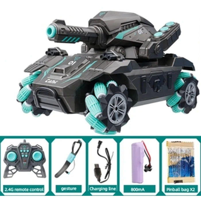 Tank na diaľkové ovládanie sa stane ideálnym darčekom pre každého malého vojaka. Pomocou diaľkového ovládania alebo indukčného ovládača na ruku je možné s tankom jednoducho jazdiť vpred, cúvať, driftovať doľava alebo doprava. Pri stlačení špeciálneho tlačidla potom z tanku vystrelíte vodnú bombu.