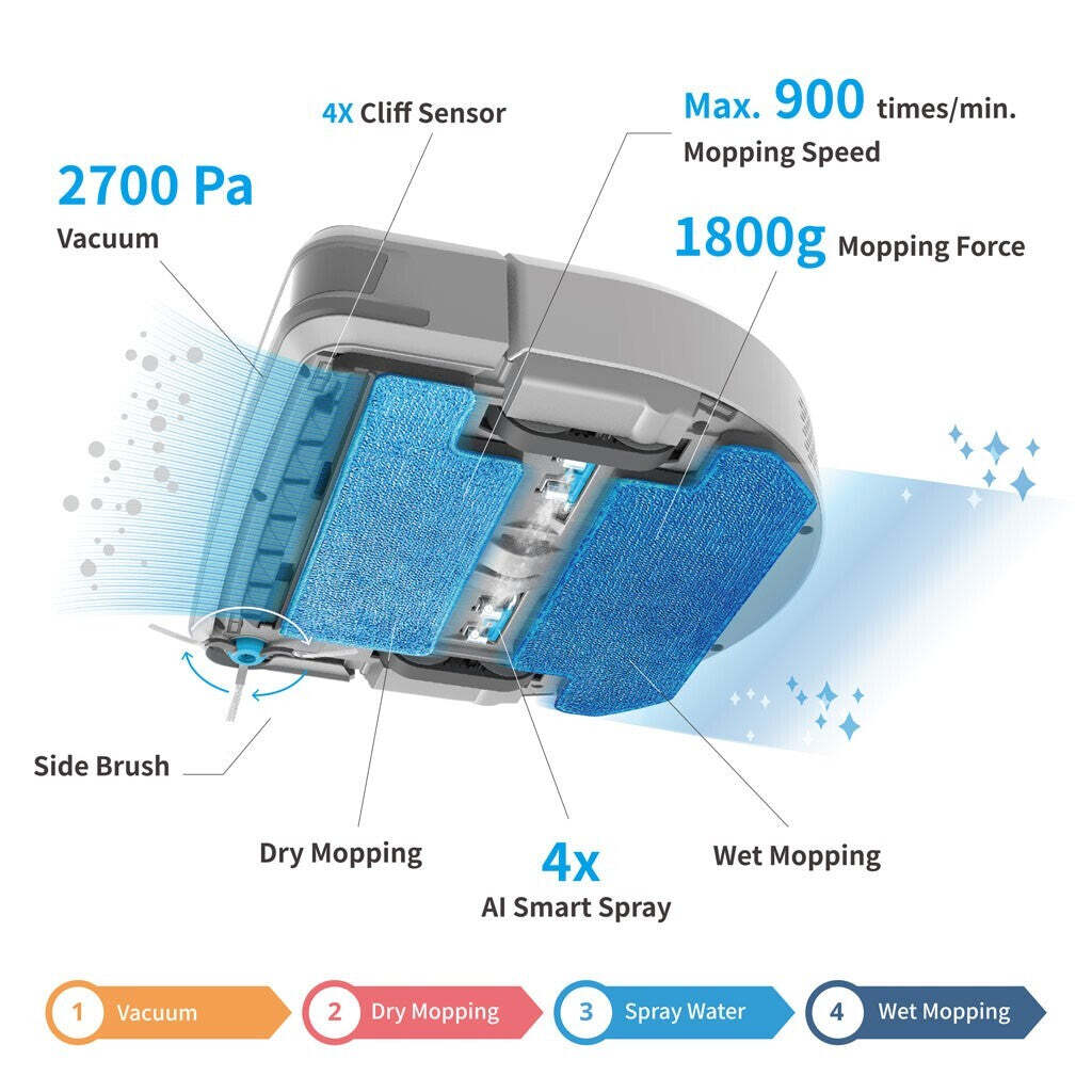 4x tryska - AI Smart SprayMnožstvo vody, ktorú robot dávkuje na čistenú podlahu, je kontrolované systémom AI Smart Spray. Vďaka tomu je množstvo dávkovanej vody ideálne pre všetky typy hladkých podláh. Množstvo vody sa reguluje v závislosti od teploty, rýchlosti odparovania vody a oblasti čistenia. Po vytrení zostane na čistenej podlahe minimálne množstvo vody. |