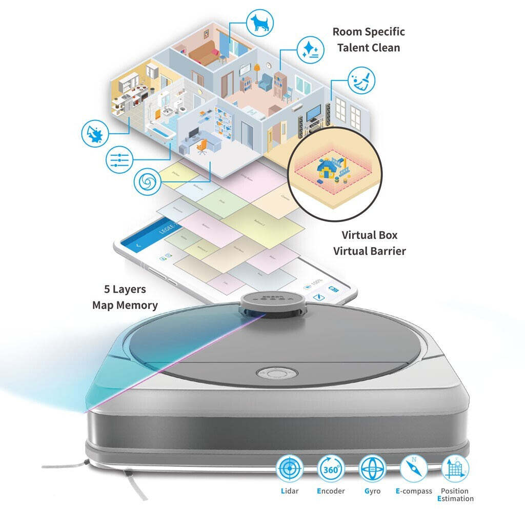Presná laserová navigácia LEGEE® SLAMDôležitou vlastnosťou robotických vysávačov je orientácia a pohyb v priestore. Presnú lokalizáciu a mapovanie pomocou laseru využíva robotický mop LEGEE 7. Pokročilá navigácia LEGEE® SLAM meria, vyhodnocuje a optimalizuje cestu upratovania pomocou LDS LIDAR, Encoder, Gyro a E-kompas. Upratovanie prebieha systematicky a maximálne efektívne bez zbytočného zdržovania. |