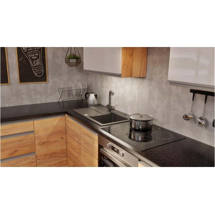 súčasťou sú dva diely čiernej pracovnej dosky s rozmermi 180x3,8x60 a 160x3,8x60 cm