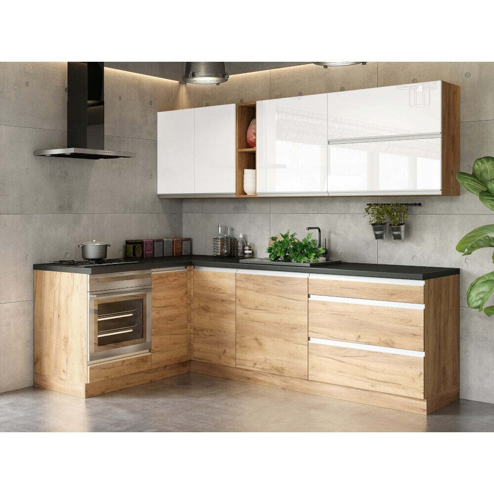 predné plochy horných skriniek sú v lesklom vyhotovení, zatiaľ čo spodné skrinky majú matnú povrchovú úpravu