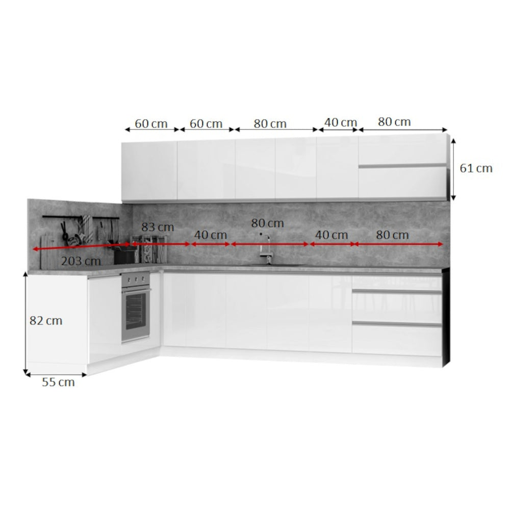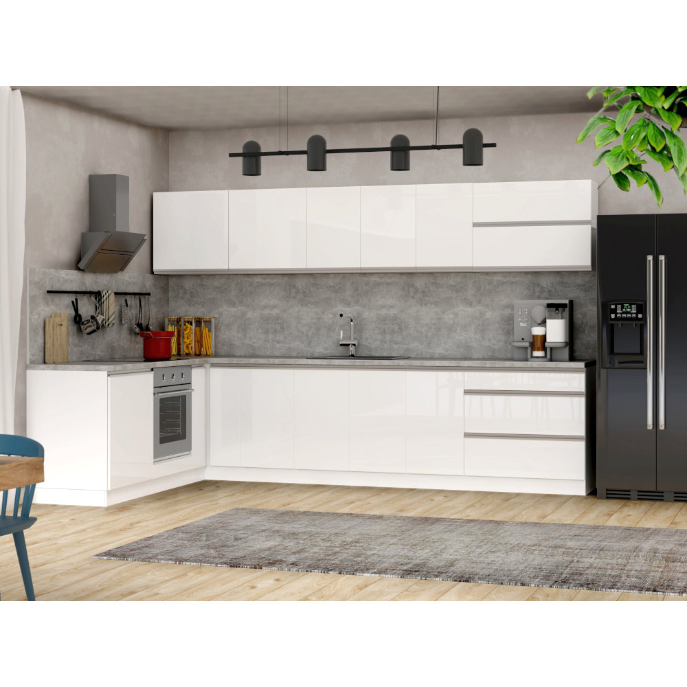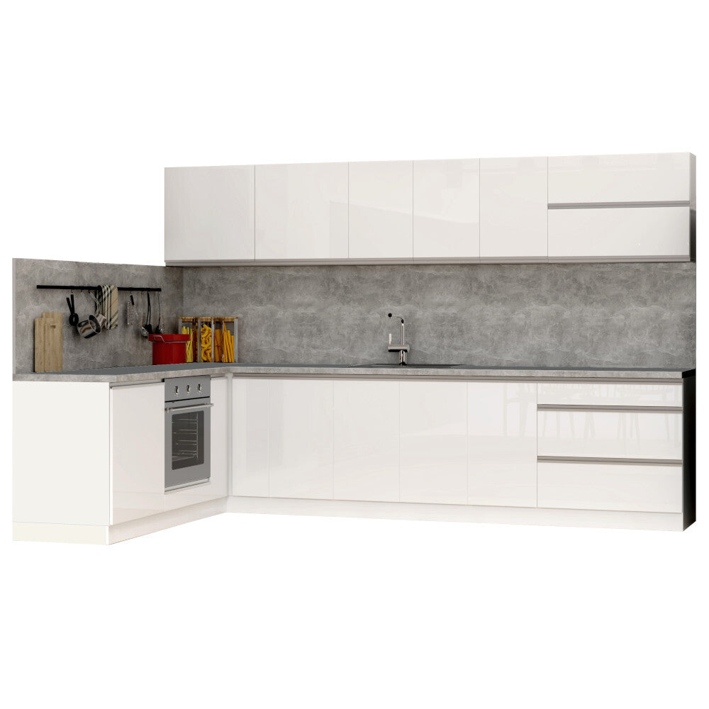 Elegantná rohová kuchyňa Maya 2 vám poskytne nadštandardný priestor na varenieKuchyňa Maya 2 spája veľmi elegantný biely design s množstvom praktických funkcií a využitia. Je vyhotovená v rozmeroch 323x203 cm a obsahuje 5 horných a 7 dolných skriniek. Spoločne tieto časti vytvárajú objemný úložný priestor, ktorý bohato vystačí na uskladnenie všetkých potrebných vecí. Jednotlivé skrinky kuchyne sú variabilné. Môžete si ich poskladať rovnako ako na vyobrazených fotografiách alebo akokoľvek budete potrebovať. Celá kuchyňa je postavená na výškovo regulovateľných nôžkach, ktorými ľahko vyrovnáte prípadné nerovnosti a potom ich ukryjete za kryciu lištu (sokel).