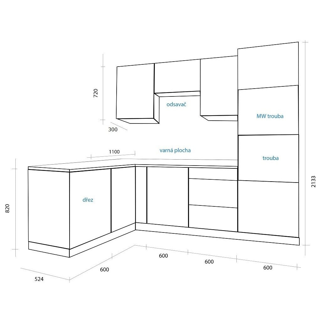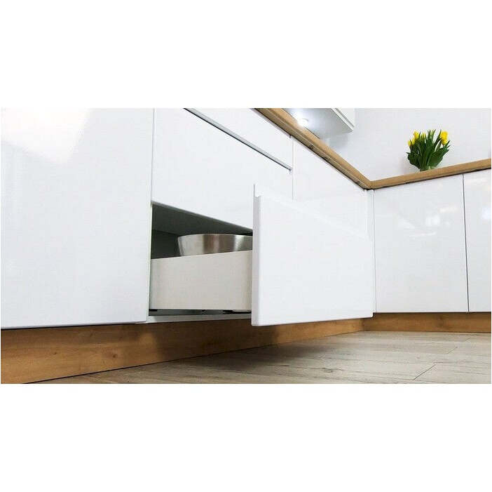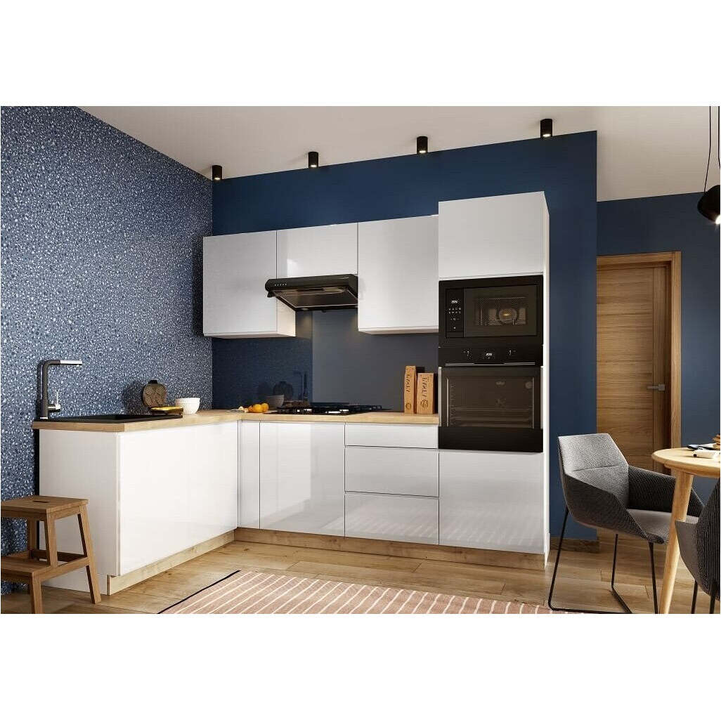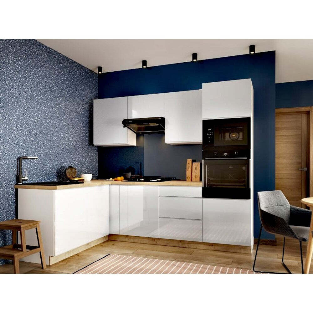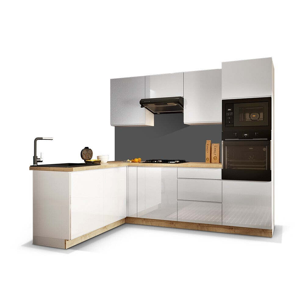 Biela rohová kuchynská linka LisseRohová kuchyňa Lisse v čistom bielom vyhotovení rozžiari vašu kuchyňu. Jednoduché prevedenie dvierok v bielom lesku v kombinácii s dekorom dreva duba arlington bude elegantným doplnkom vášho domova. Biela kuchyňa do L s rozmermi 255x170 cm ponúka dostatočne veľký úložný priestor a množstvo praktických funkcií. O váš bezpečný pohyb v kuchyni sa postarajú vyfrézované úchytky, vďaka ktorým v rohovej kuchyni nič nevyčnieva a pôsobí tak celistvým dojmom. Celá rohová kuchynská linka je postavená na výškovo regulovateľných nožičkách, ktorými ľahko vyrovnáte prípadné nerovnosti a potom ich ukryjete za kryciu lištu (sokel).