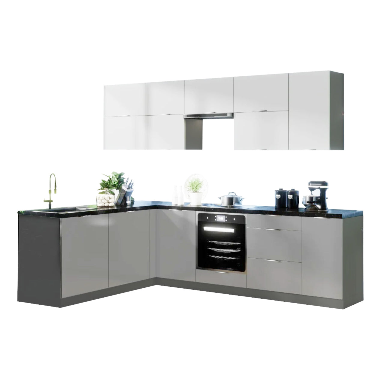 Sektorová kuchyňa Mindy je skvelou voľbou ako štýlovo zariadiť vašu kuchyňuModerná kuchyňa Mindy sa stane príjemným miestom, kde budete s radosťou pripravovať vaše jedlá.Elegantná rohová kuchyňa s rozmermi 270x180 cm disponuje prakticky členeným, veľkorysým úložným aj pracovným priestorom, ktorý zabezpečuje celkom 11 skriniek v hornej i spodnej časti kuchyne. Vzhľad sektorovej kuchyne Mindy určuje predovšetkým zvolený dekor. Tým je svetlosivá farba horných skriniek a sivá platinum u dolných skriniek v matnom vyhotovení, čo je elegantná a moderná voľba. V kombinácii s čiernou pracovnou doskou a korpusu v dekore grafitu vyzerá kuchynská linka naozaj skvele. Dvierka skriniek sú vybavené pevnými pántmi s funkciou tlmeného zatvárania. Vďaka nim prebieha zatváranie dvierok v úplnej tichosti a vy sa tak môžete plne sústrediť na varenie. Jednotlivé skrinky kuchyne sú variabilné a môžete ich tak poskladať rovnako ako na vyobrazených fotografiách alebo akokoľvek inak budete potrebovať.