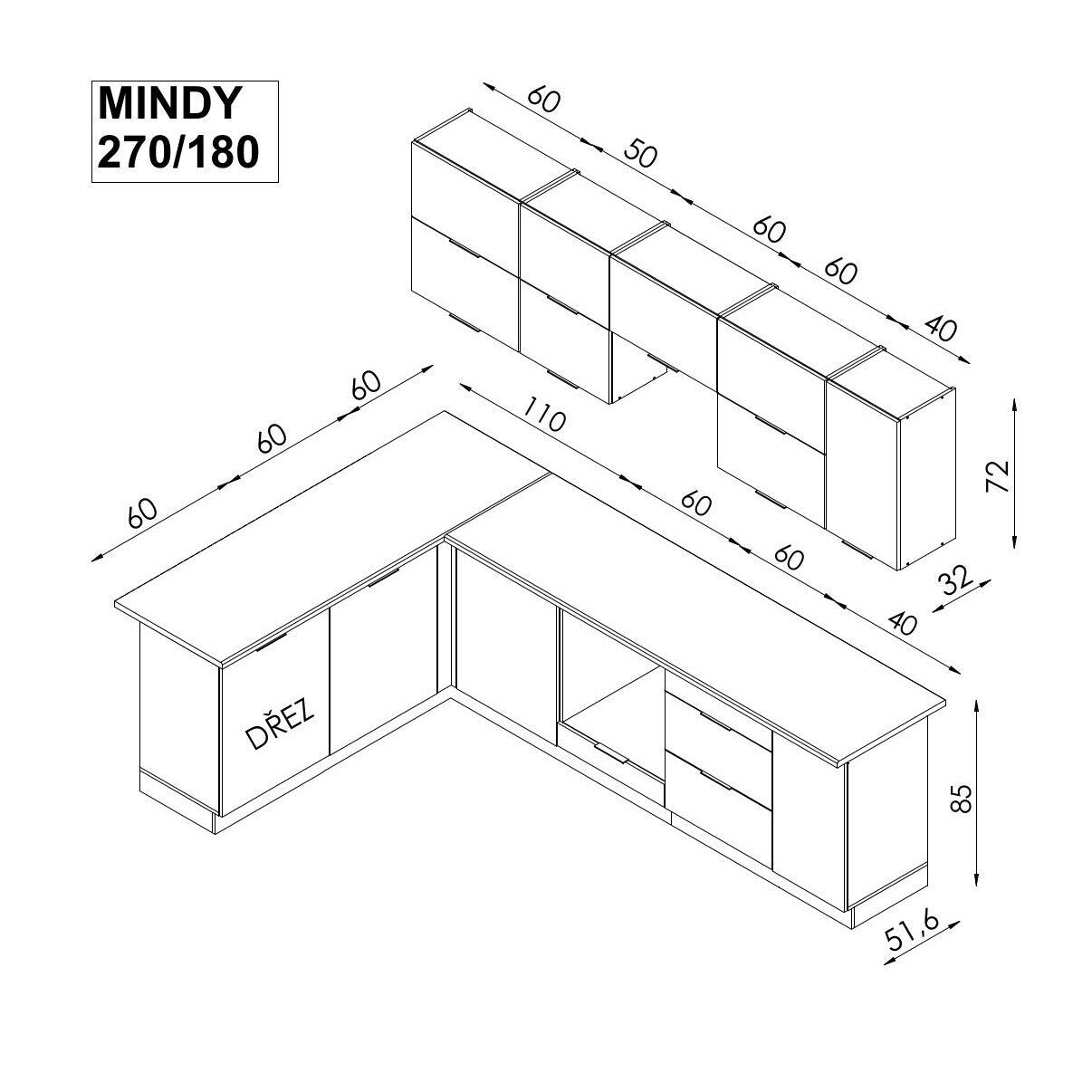 Sektorová kuchyňa Mindy je skvelou voľbou ako štýlovo zariadiť vašu kuchyňuModerná kuchyňa Mindy sa stane príjemným miestom, kde budete s radosťou pripravovať vaše jedlá.Elegantná rohová kuchyňa s rozmermi 270x180 cm disponuje prakticky členeným, veľkorysým úložným aj pracovným priestorom, ktorý zabezpečuje celkom 11 skriniek v hornej i spodnej časti kuchyne. Vzhľad sektorovej kuchyne Mindy určuje predovšetkým zvolený dekor. Tým je svetlosivá farba horných skriniek a sivá platinum u dolných skriniek v matnom vyhotovení, čo je elegantná a moderná voľba. V kombinácii s čiernou pracovnou doskou a korpusu v dekore grafitu vyzerá kuchynská linka naozaj skvele. Dvierka skriniek sú vybavené pevnými pántmi s funkciou tlmeného zatvárania. Vďaka nim prebieha zatváranie dvierok v úplnej tichosti a vy sa tak môžete plne sústrediť na varenie. Jednotlivé skrinky kuchyne sú variabilné a môžete ich tak poskladať rovnako ako na vyobrazených fotografiách alebo akokoľvek inak budete potrebovať.