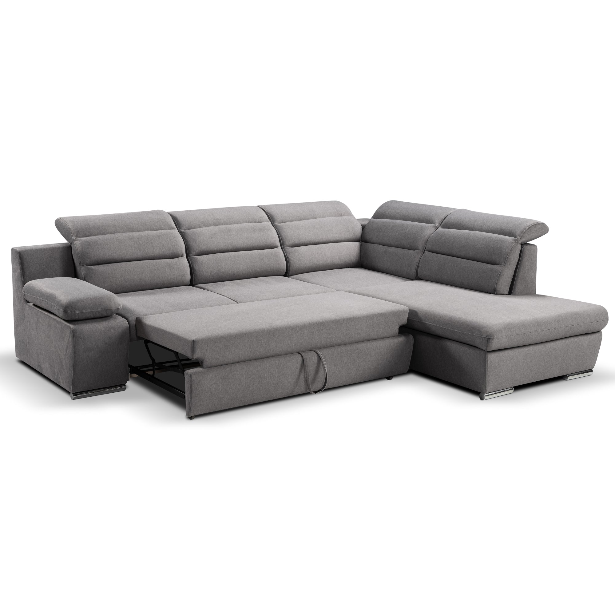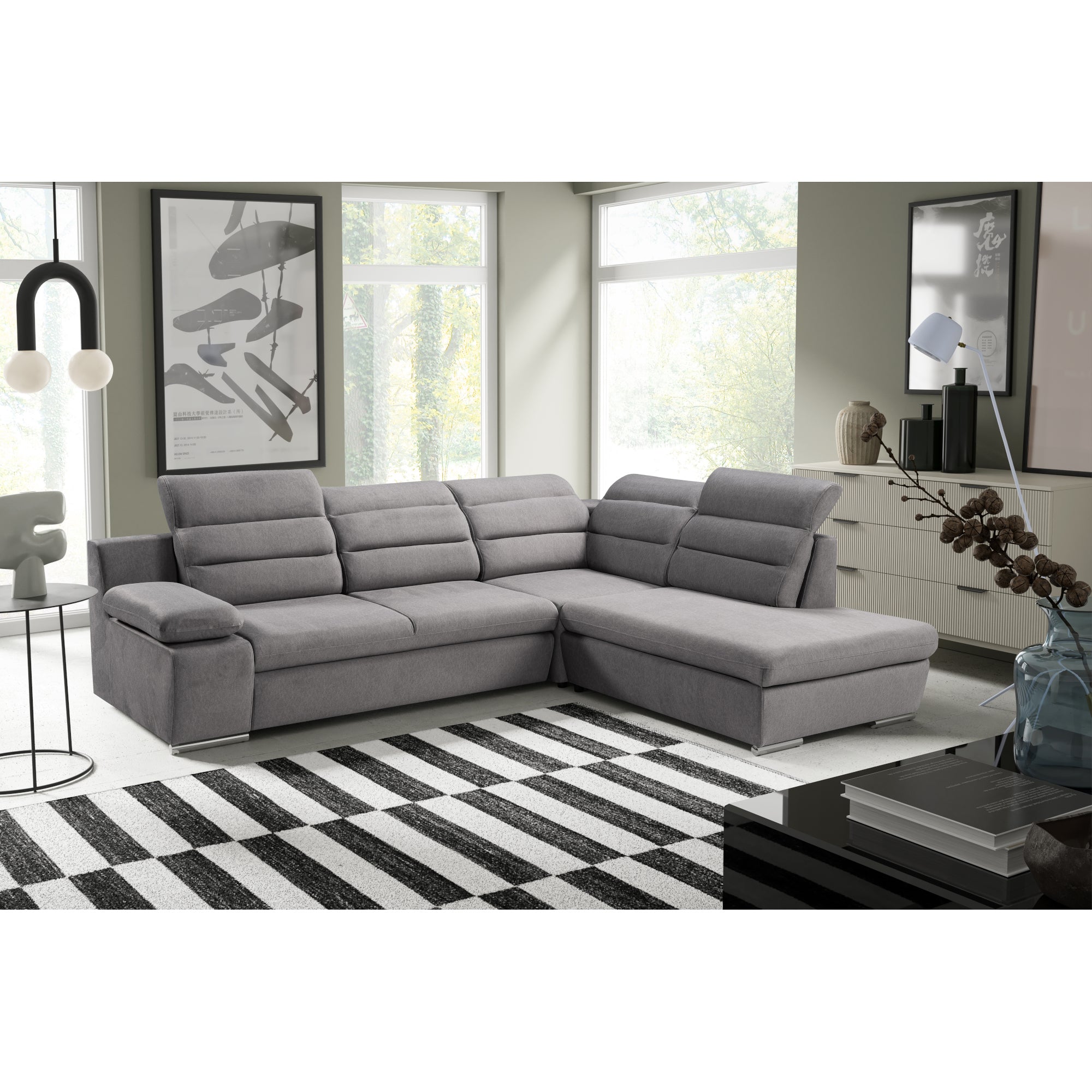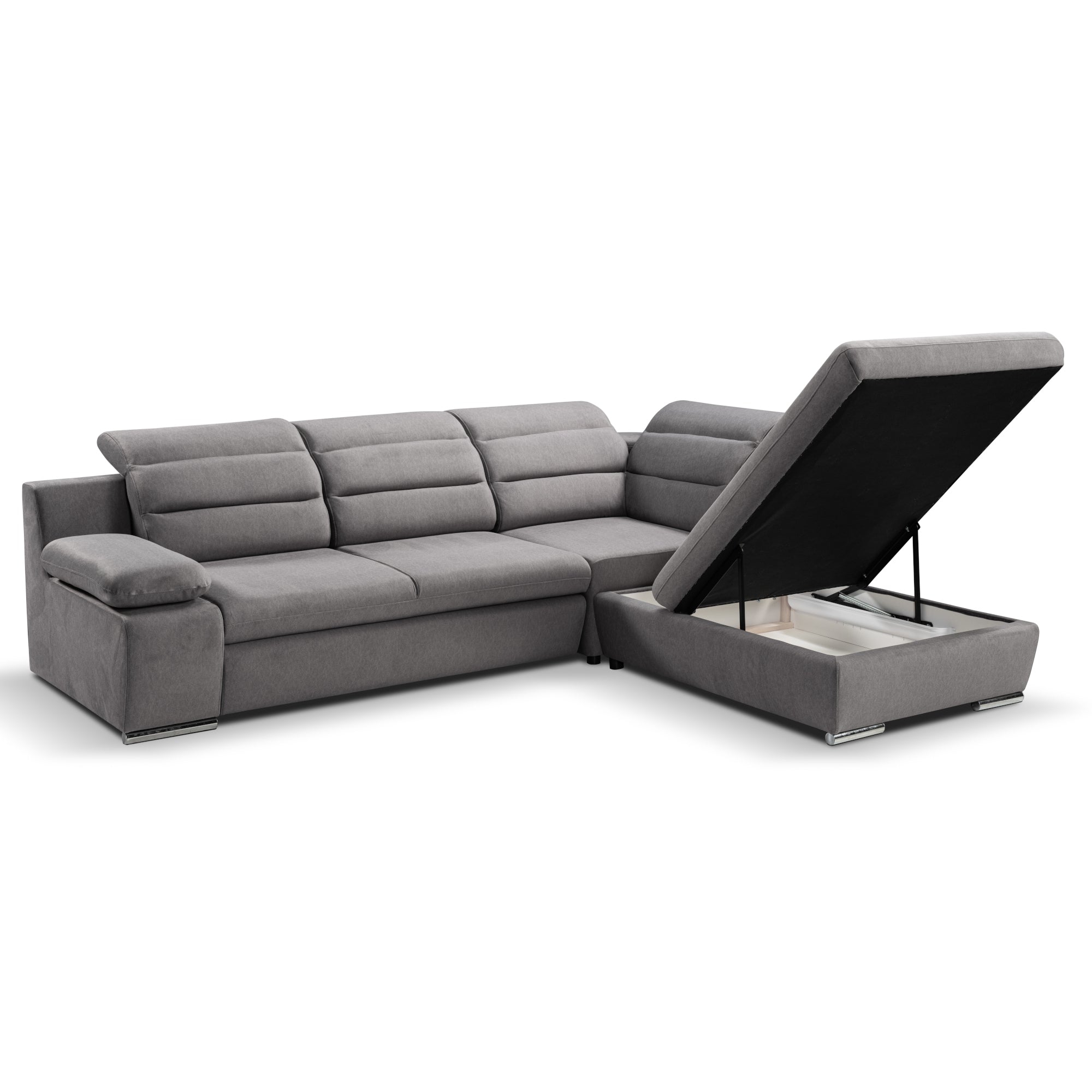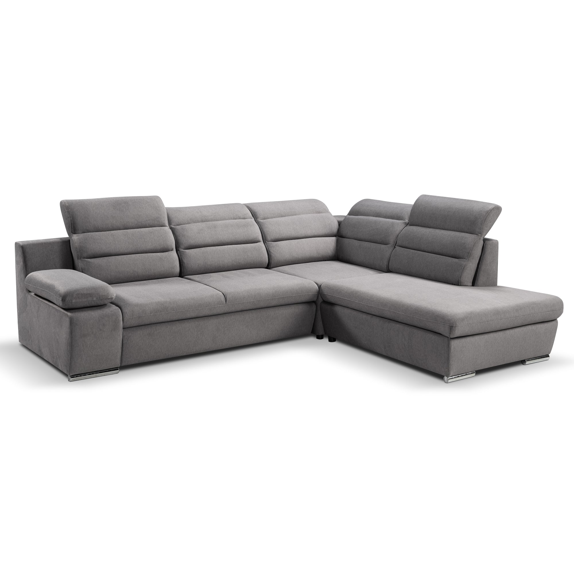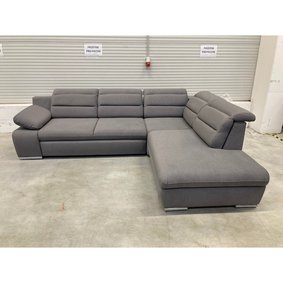 Rohová sedacia súprava Greco je tým pravým miestom na odpočinok a chvíle s rodinou. Táto sedacia súprava ponúka dostatok priestoru na sledovanie televízie, čítanie obľúbenej knihy alebo na ňu môžete len tak leňošiť. Je vyrobená v modernom a príjemnom dekore šedej , vďaka ktorej sa táto sedačka stane dominantným kusom nábytku vo vašej obývačke. Komfort pri odpočinku zvyšujú aj polohovateľné podhlavníky, ktoré si môžete nastaviť podľa svojich požiadaviek. Sedačka disponuje rozkladom na lôžko či úložným priestorom , ktoré sú vyhľadávanou vlastnosťou moderných sedačiek. Pevná konštrukcia spoločne so striebornými nôžkami zaručuje stabilitu. Ideálna výška 42 cm sedákov od zeme umožňuje ľahké sadanie a vstávanie zo sedačky bez väčšej námahy.