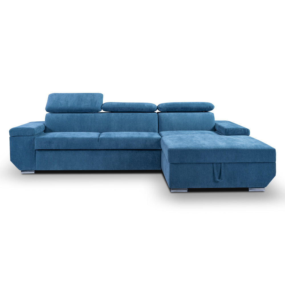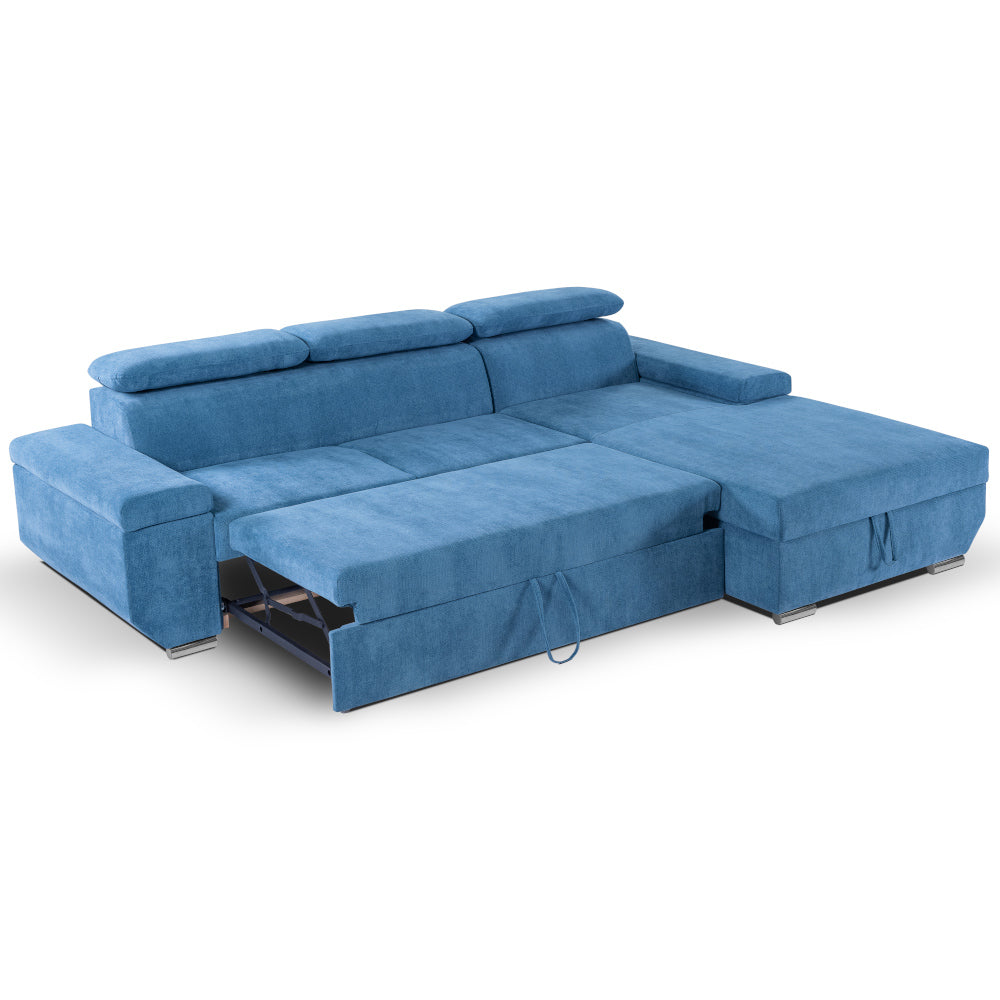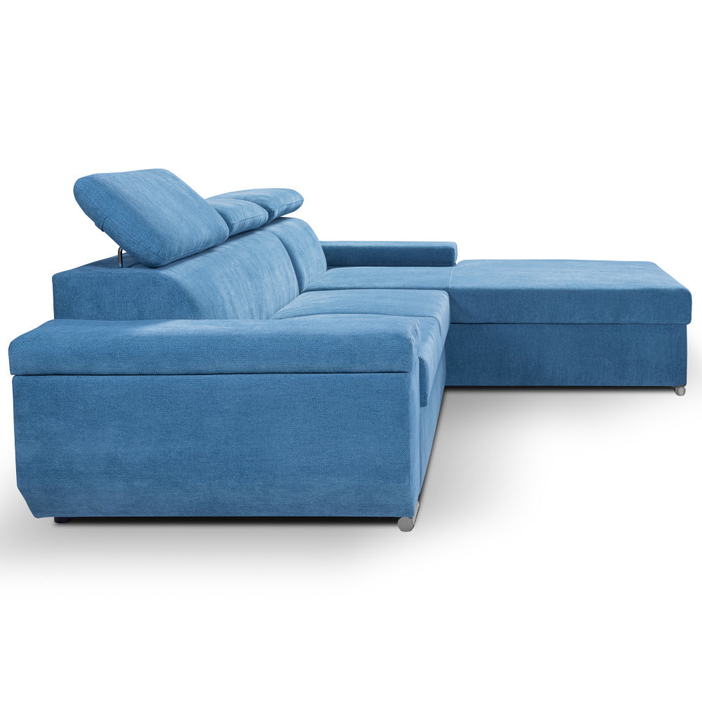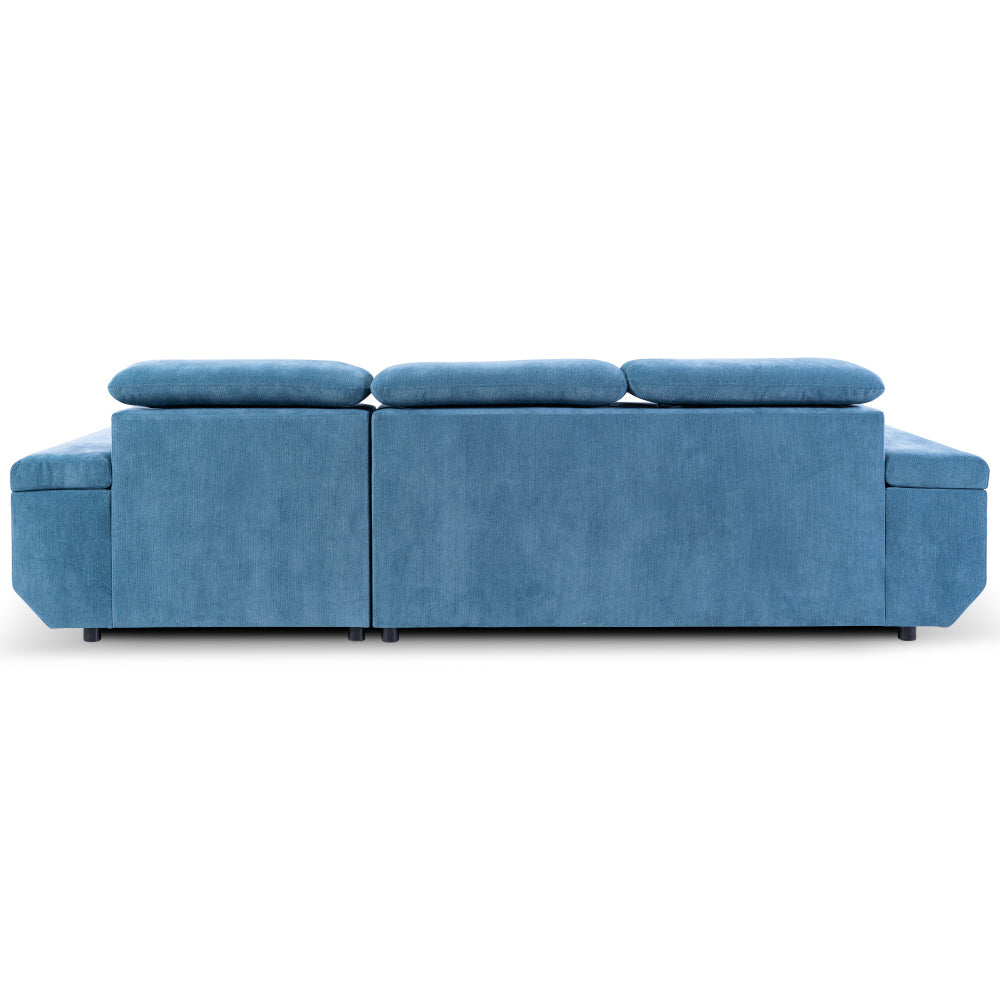 Moderná pohovka New Gans je ten správny typ nábytku do vašej obývačkyPohovka New Gans vás na prvý pohľad zaujme svojím moderným dizajnom. Pohovka je nielen vizuálne príťažlivá, ale poteší vás aj svojimi praktickými funkciami a ergonómiou, ktoré zabezpečia pohodlné sedenie a vstávanie. Patrí medzi ne rozkladacie lôžko s rozmermi 212 × 123 cm, úložný priestor a čalúnené operadlo, ktoré vám umožní umiestniť pohovku voľne do priestoru. Postranách sa nachádzajú pevné podrúčky a tri nastaviteľné opierky hlavy pre väčšie pohodlie (poloha opierky hlavy určuje výšku sedadla, ktorá sa pohybuje v rozmedzí 84-95 cm). Kvalitný látkový materiál čalúnenia v modrej farbe spolu s výplňou vytvára ideálne podmienky na kvalitný odpočinok.