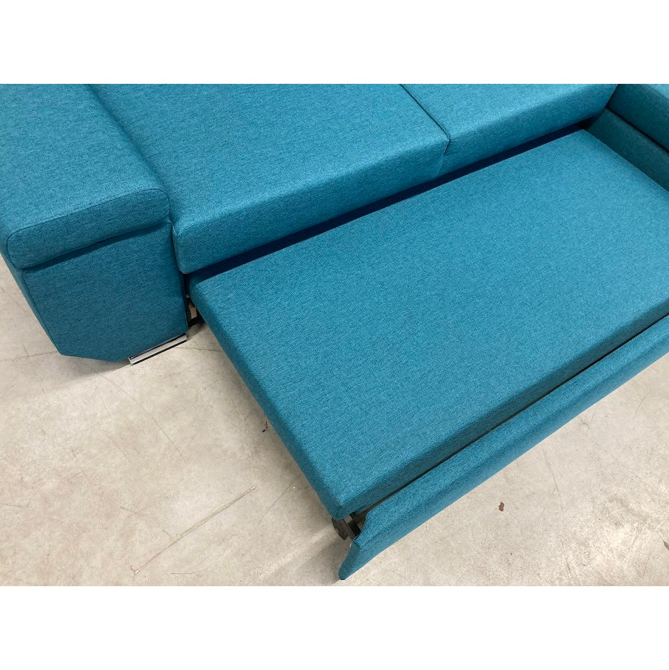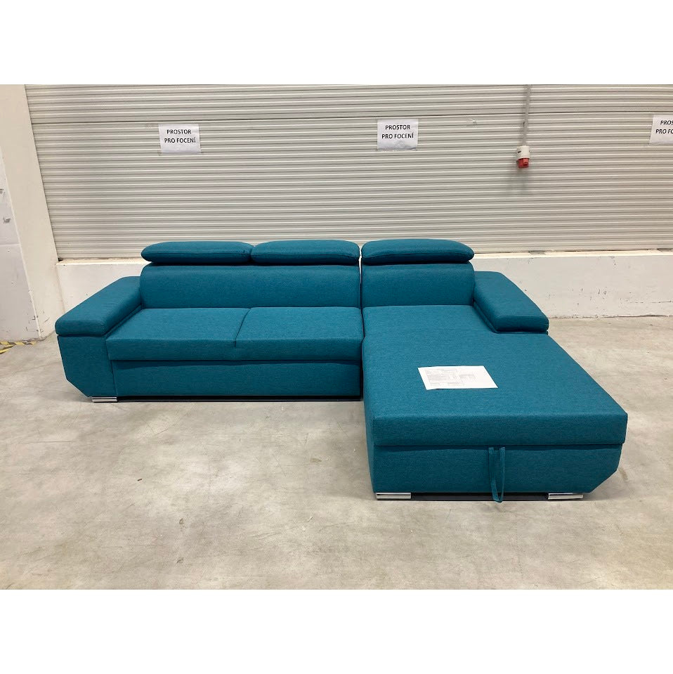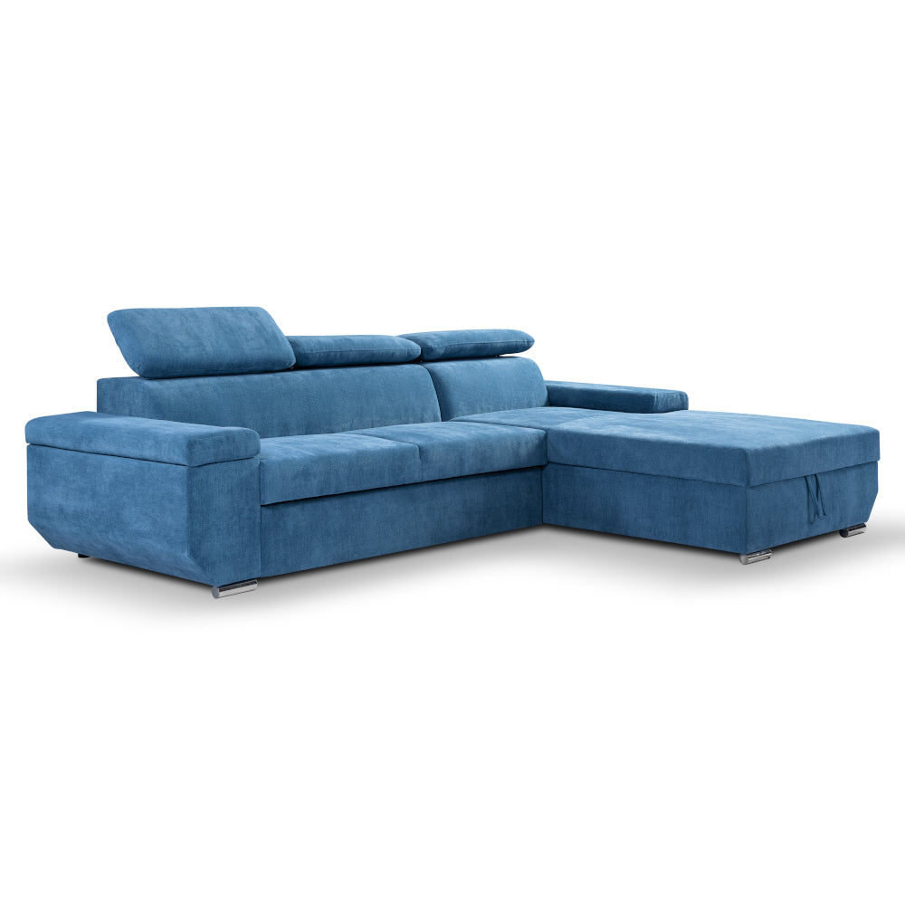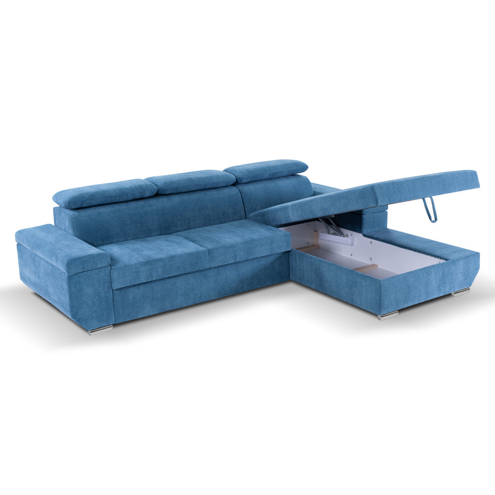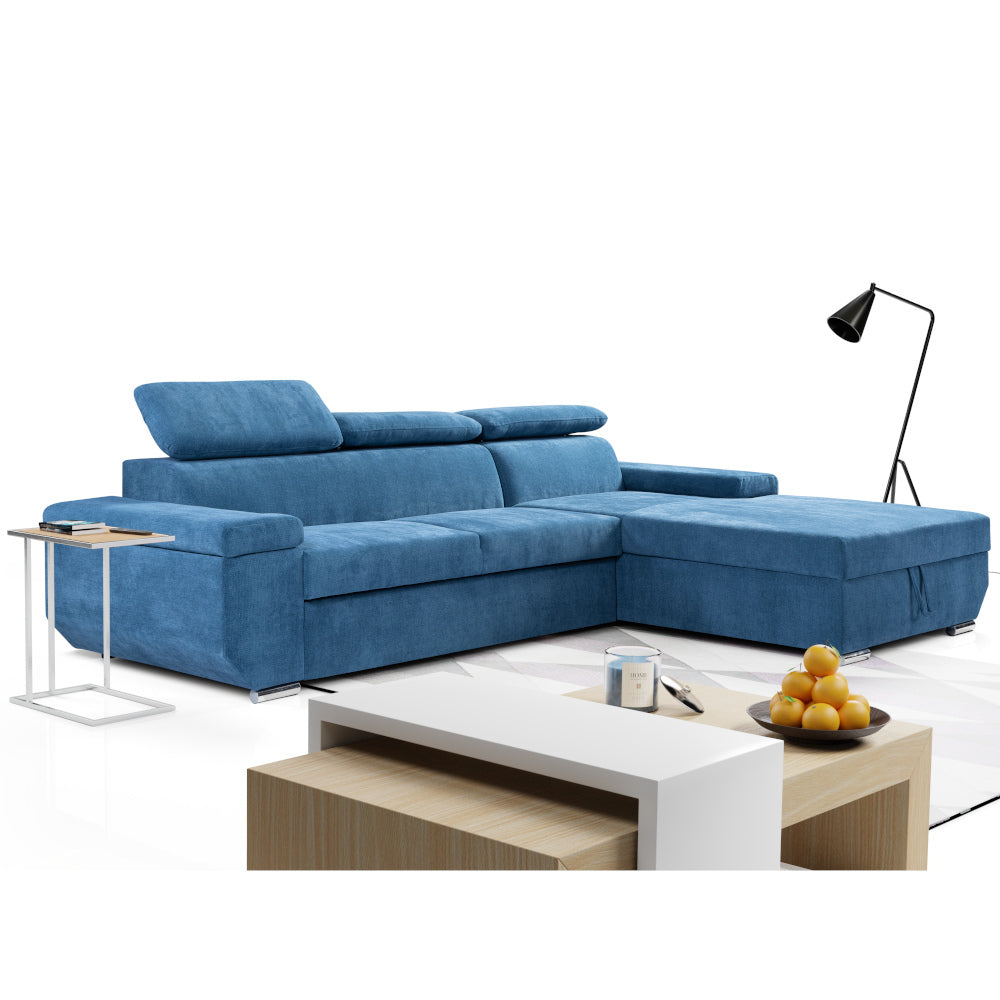Moderná pohovka New Gans je ten správny typ nábytku do vašej obývačkyPohovka New Gans vás na prvý pohľad zaujme svojím moderným dizajnom. Pohovka je nielen vizuálne príťažlivá, ale poteší vás aj svojimi praktickými funkciami a ergonómiou, ktoré zabezpečia pohodlné sedenie a vstávanie. Patrí medzi ne rozkladacie lôžko s rozmermi 212 × 123 cm, úložný priestor a čalúnené operadlo, ktoré vám umožní umiestniť pohovku voľne do priestoru. Postranách sa nachádzajú pevné podrúčky a tri nastaviteľné opierky hlavy pre väčšie pohodlie (poloha opierky hlavy určuje výšku sedadla, ktorá sa pohybuje v rozmedzí 84-95 cm). Kvalitný látkový materiál čalúnenia v modrej farbe spolu s výplňou vytvára ideálne podmienky na kvalitný odpočinok.