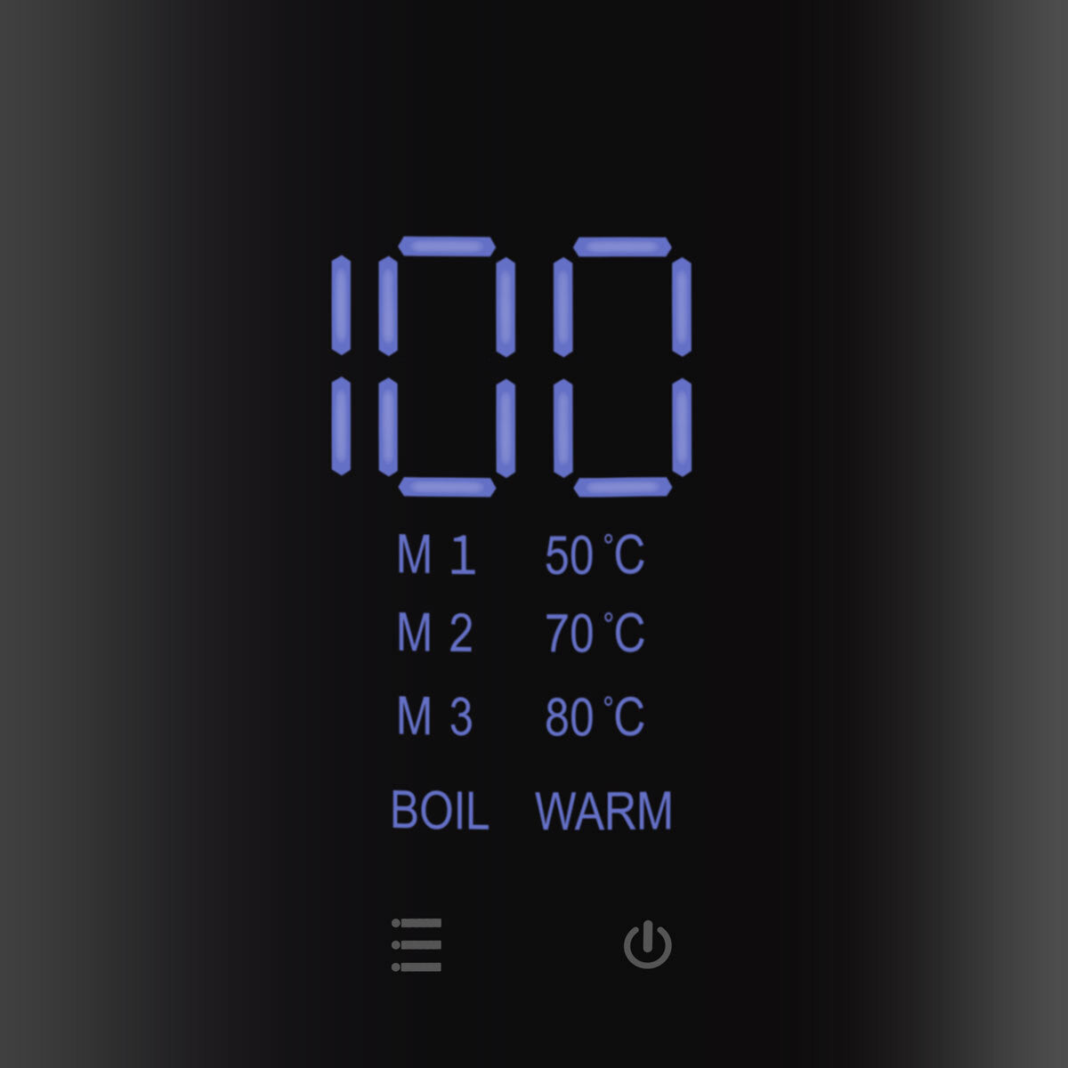 Nastaviteľná teplotaTáto kanvica ponúka elektronicky regulovanú teplotu varu a možnosť udržiavania teploty, čo ju robí ideálnou voľbou na prípravu rôznych druhov čajov, vrátane zeleného, čierneho či jazmínového čaju. S možnosťami nastavenia teploty (50, 70, 80 alebo 100 °C) a ukazovateľom aktuálnej teploty vody pri varení získate vždy dokonalý nápoj. Modro podsvietená kontrolka potom jasne signalizuje stav zapnutia či vypnutia, dopĺňajúci moderný dizajn tejto kanvice. |