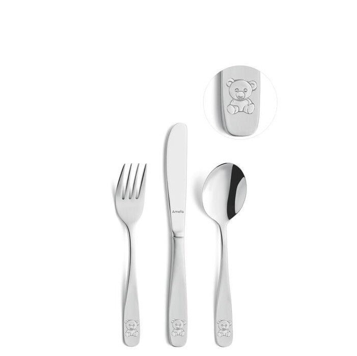Súprava detských príborovSúprava príborov Teddy sa skladá z troch kusov. V darčekovom balení tak nájdete lyžicu, vidličku a nôž. Príbory sú vyrobené z nerezu, ktorý je vhodný pre každodenné používanie. Na rukoväti každého kusu príboru sa nachádza roztomilý medvedík a pre čo najdlhšie uchovanie potlače je vhodné príbor nevkladať do umývačky riadu, ale radšej ho umývať ručne. Pre maximálnu bezpečnosť detí nie sú vidlička a nôž úplne nabrúsené, tak kúpte svojmu dieťaťu krásnu súpravu príborov, s ktorou ich aj jedlo bude baviť. |
