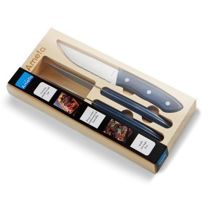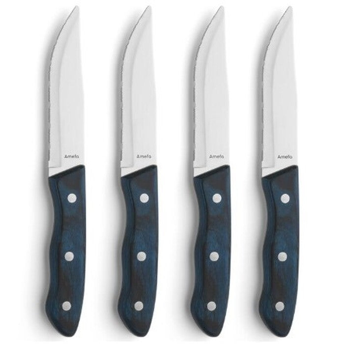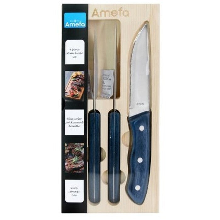 Súprava steakových nožovSúprava 4 steakových nožov je neoddeliteľnou súčasťou každej kuchyne. Nože sú opatrené zúbkami na jednoduché krájanie mäsa a použiť ich môžete aj ako príborové nože na krájanie zeleniny. Vďaka materiálu z nerezovej ocele sa neotupia. Praktická rukoväť z čierneho dreva prispeje k bezpečnej manipulácii. Nože sú uložené v drevenej kazete. |