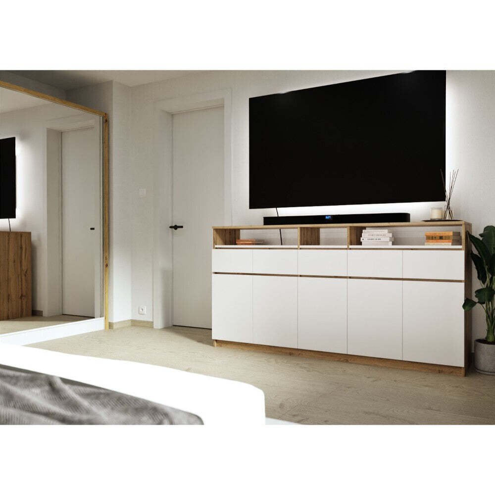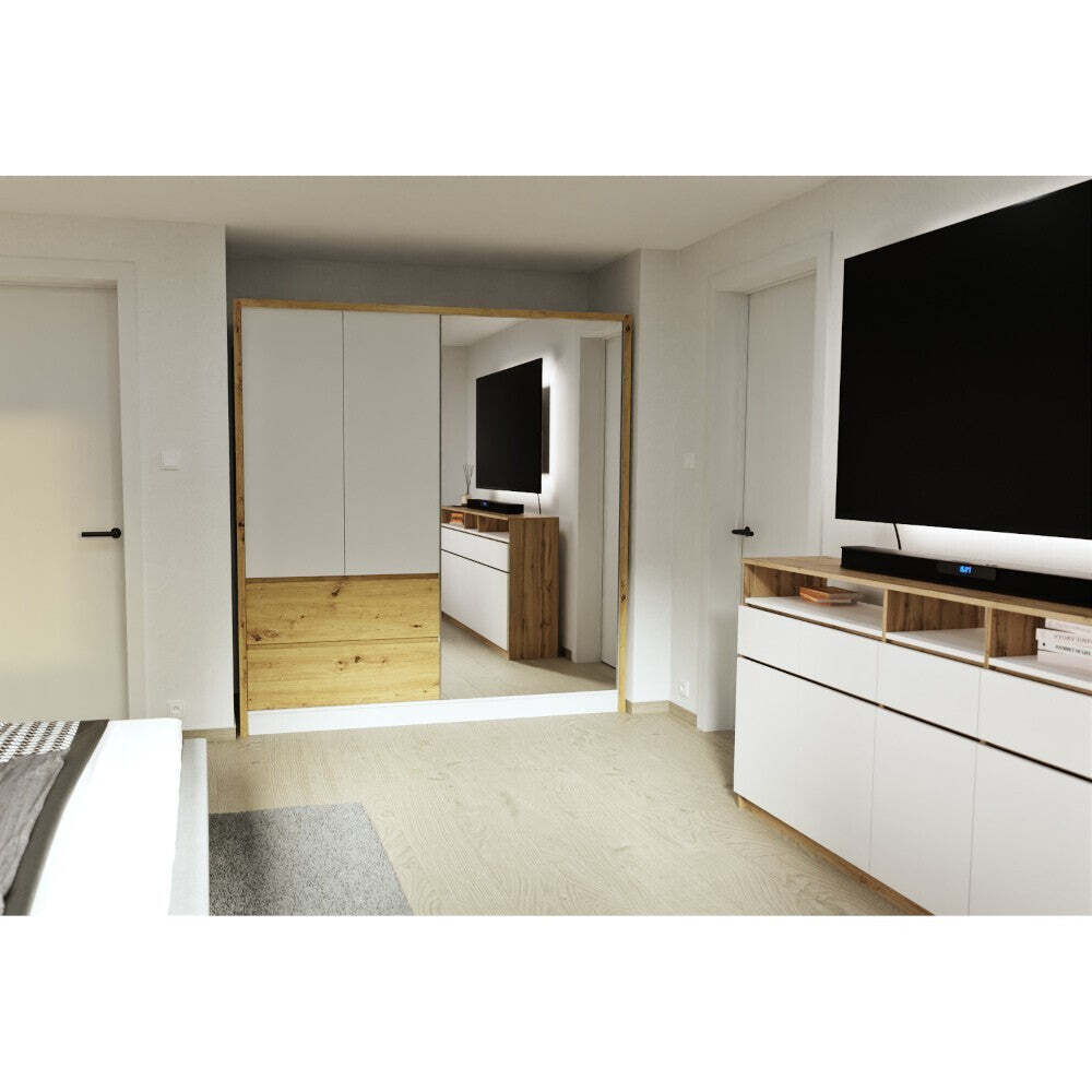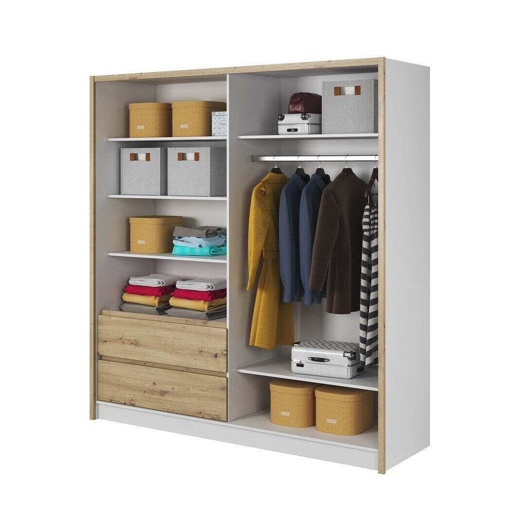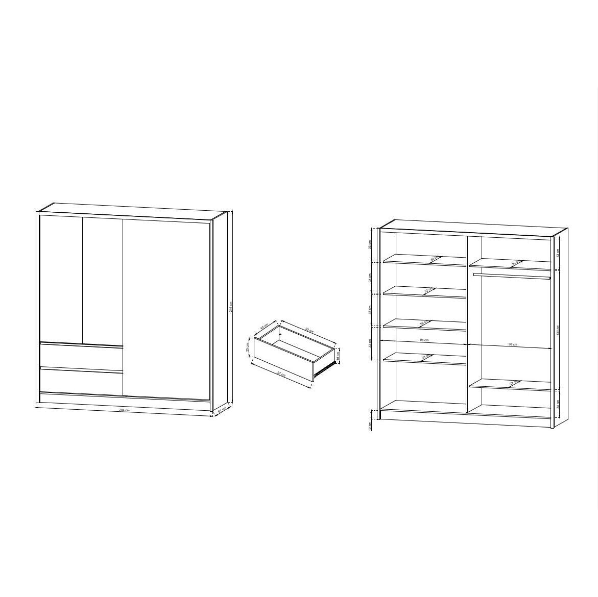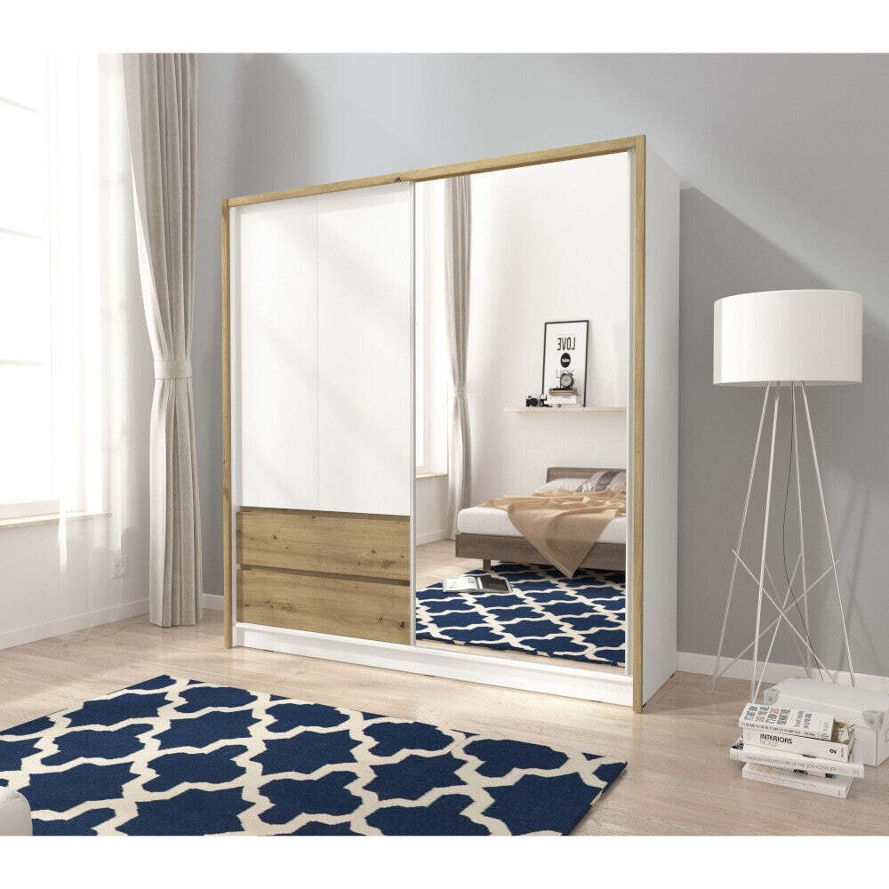 Šatníková skriňa so zrkadlom LetiaElegantná šatníková skriňa Letia je maximálne praktická a skvele zapadne do vašej domácnosti. Úložné priestory sú dnes v domácnostiach už samozrejmosťou, bez ktorej by sme veľmi ťažko udržovali priestory našich domov či bytov v čistote a poriadku. Moderná skriňa s posuvnými dverami Letia ponúka všetko potrebné, aby splnila vaše požiadavky. Na prvý pohľad je vidieť, že je moderným dizajnovým kúskom, ktorý miestnosť rozžiari a dodá jej kus elegancie. Zrkadlo je súčasťou dverí. Navyše zrkadlá (všeobecne) miestnosť opticky zväčšia a presvetlia. Kvalitne spracovaná skriňa je vyrobená z laminátovej drevotriesky, ktoré majú dlhú životnosť a jednoduchú údržbu. Vnútri skrine sa nachádza niekoľko políc, ktoré ponúkajú dostatok priestoru pre oblečenie všetkého druhu. Priestor na bundy, šaty, košele či iné oblečenie, ktoré by ste radšej mali zavesené na vešiaku, sa nachádza v pravej časti, kde je jedna polica a tyč na vešiaky. Navyše sú k dispozícii aj zásuvky. |