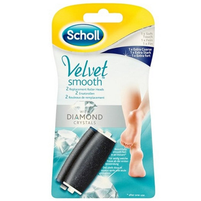 Rotačná hlavica Scholl Velvet SmoothTM s diamantovými kryštálikmi - extra hrubá na veľmi tvrdú, ťažko odstrániteľnú kožu a jemná hlavica pre perfektne hebký výsledok. Tieto náhradné hlavice doporučujeme používať výhradne s Scholl Velvet SmoothTM elektrickým pilníkom na chodidlá.