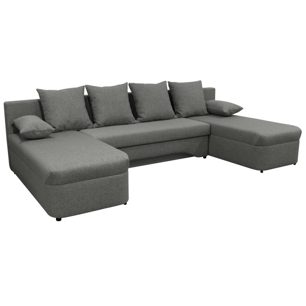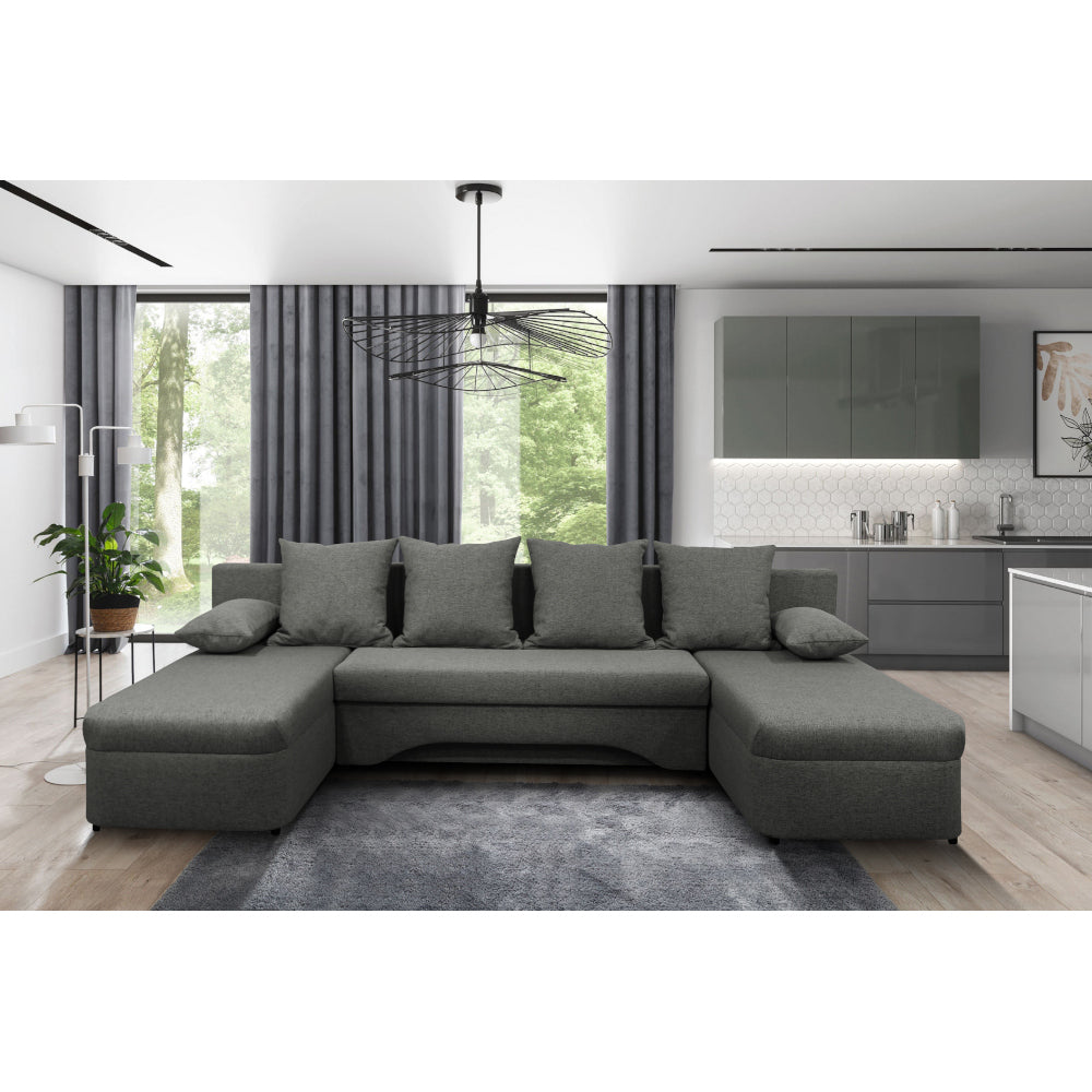 Moderná sedacia súprava LaugarModerná sedacia súprava Laugar v tvare U vám poskytne priestor na pohodlný odpočinok. Vďaka svojmu atraktívnemu dizajnu a čiernemu vyhotoveniu ľahko zapadne do každého interiéru. Pohovka vám ponúka nielen množstvo praktických funkcií, ale jej ergonómia vám zabezpečí veľmi luxusné pohodlie pri sedení aj ležaní. Medzi jej vlastnosti patrí veľmi priestranné lôžko s rozmermi 252 × 104 cm, na ktorom sa pohodlne vy alebo vaši hostia vyspíte, ako aj veľkorysý úložný priestor, do ktorého môžete uložiť posteľnú bielizeň a mať istotu, že sa na ňu nezapráši. Pohovka je doplnená celkom šiestimi vankúšmi pre väčšie pohodlie.