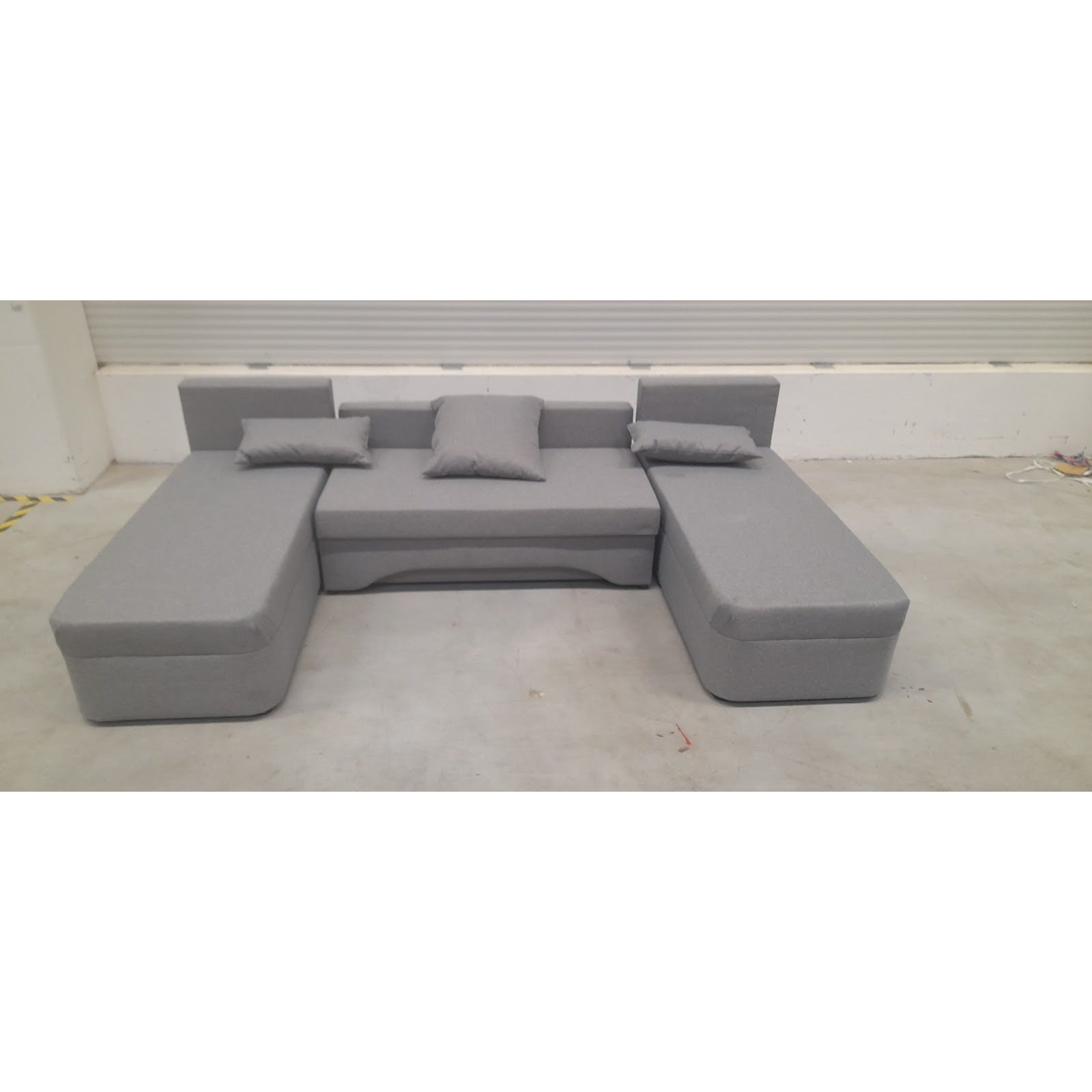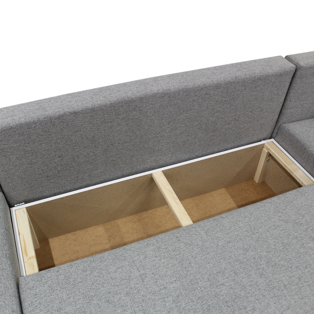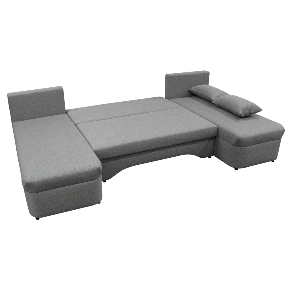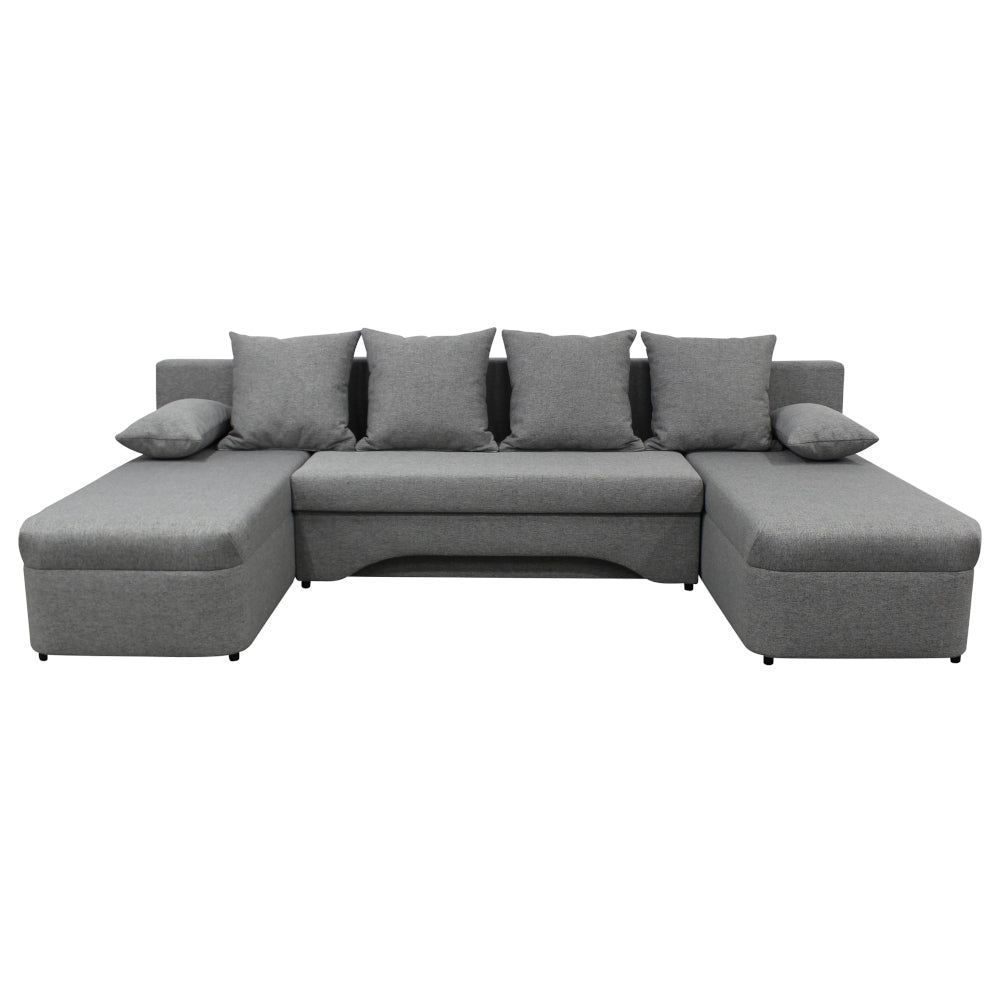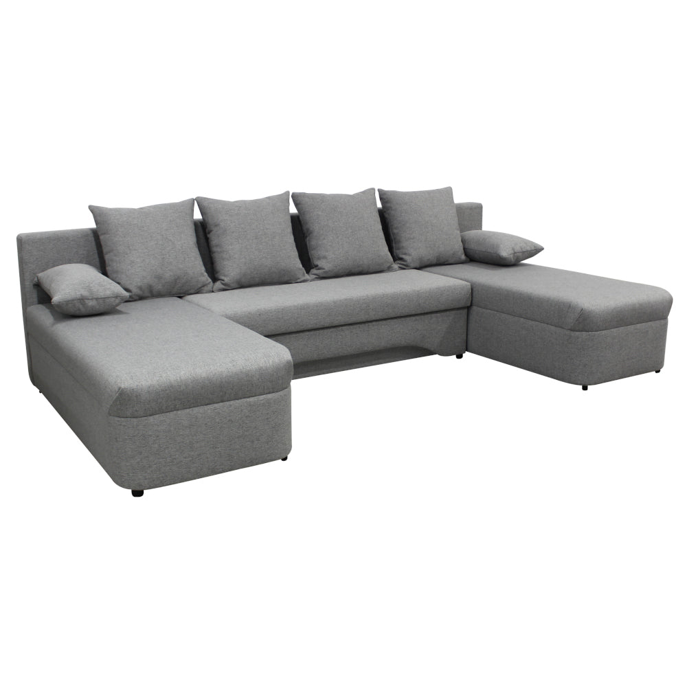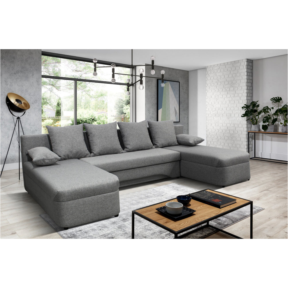 Moderná sedacia súprava LaugarModerná sedacia súprava Laugar v tvare U vám poskytne priestor na pohodlný odpočinok. Vďaka svojmu atraktívnemu dizajnu a sivému vyhotoveniu ľahko zapadne do každého interiéru. Pohovka vám ponúka nielen množstvo praktických funkcií, ale jej ergonómia vám zabezpečí veľmi luxusné pohodlie pri sedení aj ležaní. Medzi jej vlastnosti patrí veľmi priestranné lôžko s rozmermi 252 × 104 cm, na ktorom sa pohodlne vy alebo vaši hostia vyspíte, ako aj veľkorysý úložný priestor, do ktorého môžete uložiť posteľnú bielizeň a mať istotu, že sa na ňu nezapráši. Pohovka je doplnená celkom šiestimi vankúšmi pre väčšie pohodlie.