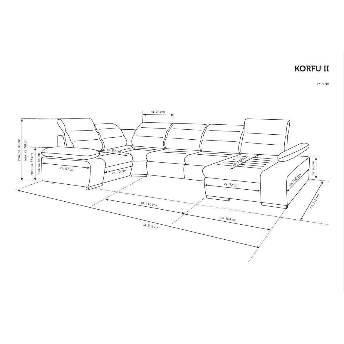 Moderná sedacia súprava Korfu IIV dnešnej dobe sa nachádza neustále viac a viac priaznivcov moderného a nevšedného dizajnu, ktorý úplne ovládne daný interiér. Takým prvkom je aj sedacia súprava Korfu II. Jednoducho sa stane dominantou miestnosti, vycibrí celkový vzhľad a navyše bude maximálne komfortný. K tomu napomáhajú aj polohovateľné podhlavníky a polohovateľné podrúčky, ktoré vám doprajú kvalitné sedenie. Pod otomanom sa nachádza úložný priestor, kam si môžete uložiť vankúše či deky. Významnou vlastnosťou sedačky je jej rozloženie na lôžko s rozmermi 210x124 cm. Prešívané operadlá a sedáky sú vyplnené mäkkou PUR penou. Pevná konštrukcia spoločne so striebornými nôžkami zaručuje stabilitu. Ideálna výška 40 cm zaručuje ľahké sadanie a vstávanie bez väčšej námahy. Sedacia súprava ponúka dostatok miesta pre vás aj celú vašu rodinu. |