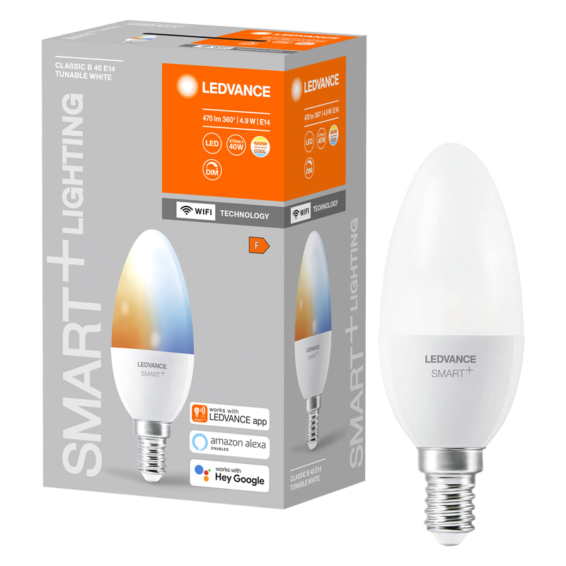 Smart žiarovkaTáto SMART LED žiarovka značky Ledvance je moderný svetelný zdroj, ktorý kombinuje chytré funkcie s vysokou energetickou účinnosťou. Táto stmievateľná žiarovka s päticou E14 a príkonom 4,9 W poskytuje svetlo s intenzitou 470 lm a môžete si ich podľa nálady či podľa potreby nastaviť od príjemnej teplej bielej (2700K), ktorá je vhodná pre chvíle odpočinku, až po studenú bielu (6500K) , ktorá je naopak ideálna na činnosti vyžadujúce sústredenie. Žiarovka je ovládateľná cez Wi-Fi pomocou mobilnej aplikácie alebo hlasových asistentov ako sú Google Assistant a Amazon Alexa. S energetickou triedou F a priemernou životnosťou 20 000 hodín prispieva k úsporám energie a ľahko sa integruje do existujúcich domácich sietí.