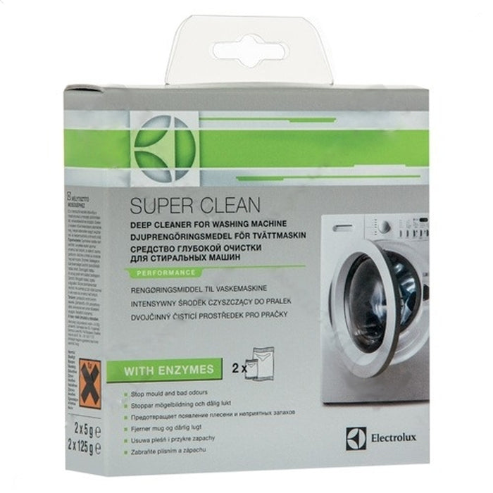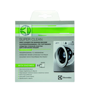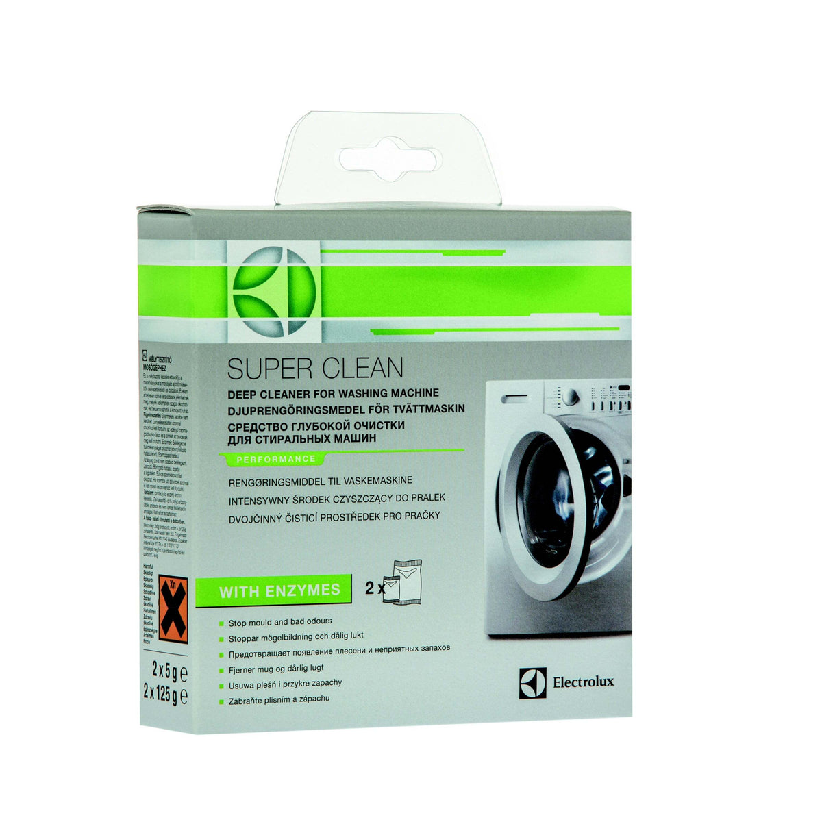 Vzhľadom k častému používaniu práčiek môže dôjsť k stavu, kedy sa v tesnení dvierok, potrubia či bubna nahromadia zvyšky pracích prostriedkov a iných nečistôt. Prostriedok Electrolux Super-Clean využíva špeciálne účinné enzýmy, vďaka ktorým dokáže dôkladne vyčistiť a odmastniť spotrebič. Tým tiež predídete nepríjemnému pachu a tvorbe škvŕn na bielizni. V jednom balení sa nachádzajú rovno dve dávky.