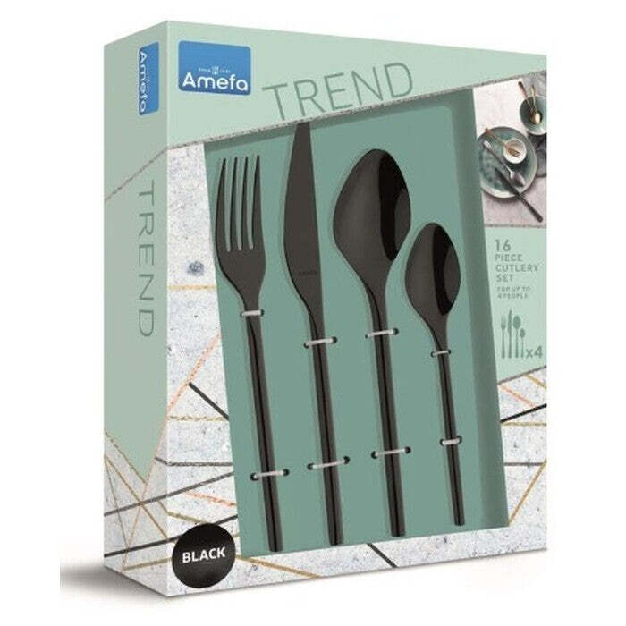 Súprava dizajnových príborovSúprava príborov s elegantným dizajnom sa stane neoddeliteľnou súčasťou každej kuchyne. Dizajnové príbory v lesklej čiernej farbe od značky Amefa sú vyrobené z kvalitnej ocele, a preto sa nemusíte báť vložiť príbory do umývačky riadu na 40°C. Kazetové balenie obsahuje jedálne nože, vidličky, polievkové lyžice a kávové lyžičky vždy po 4 kusoch. |