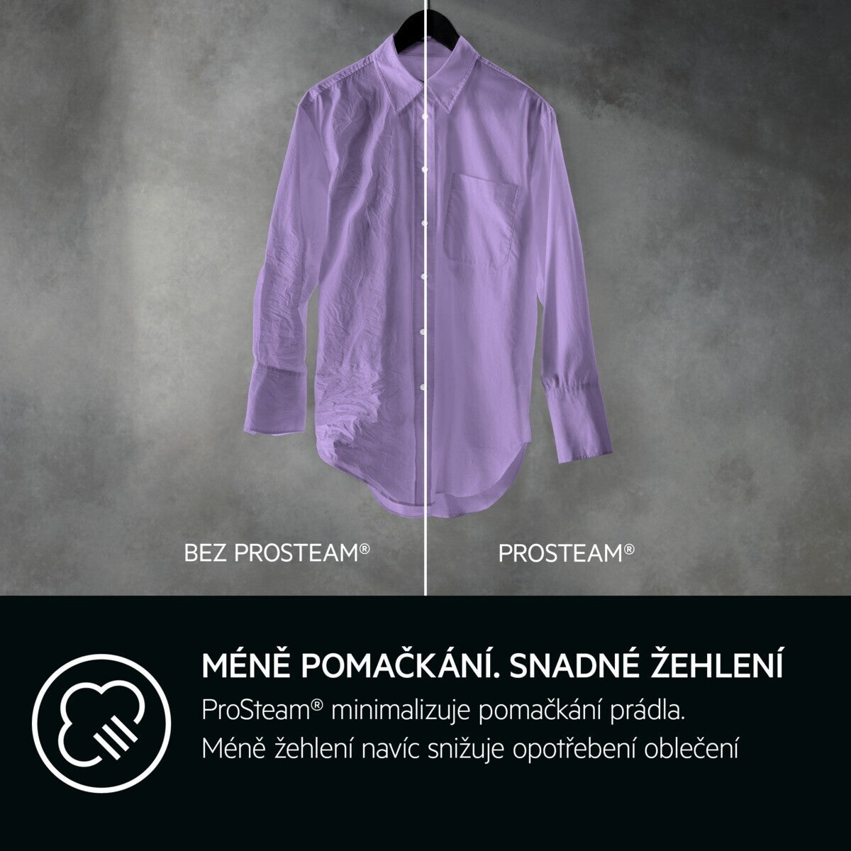 Menej stláčanieFunkcia ProSteam pomáha pri sušení neutralizovať pachy a taktiež redukovať stláčanie. Oblečenie tak vyberiete buď pripravené na nosenie alebo vyžadujúce minimálne úsilie pri žehlení. |