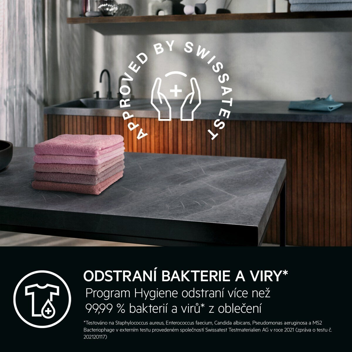 Bez bakteriíSpeciální program Hygine s certifikací od společností Swissatest dokáže při sušení teplotou 60 °C odstranit až 99,9 % bakterií a virů. Vaše ručníky, polštáře, přikrývky i oblečení tak budete vyndávat nejen čisté a hebké, ale i s důvěrou v jeho šetrnost. |