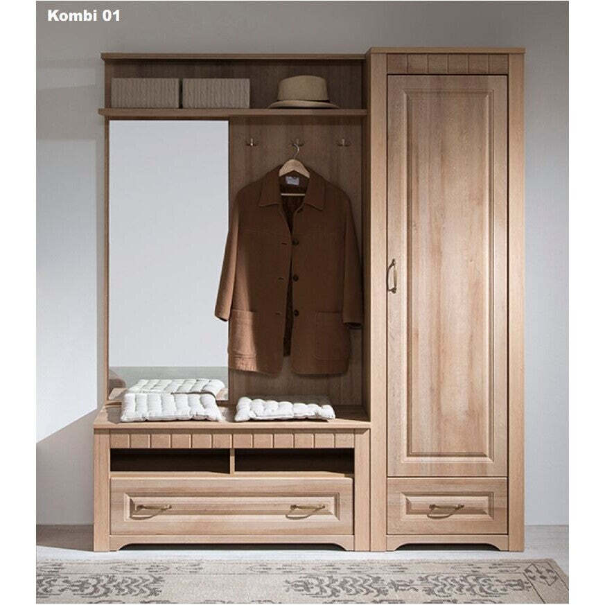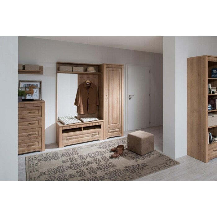 Zostava sa skladá zo šatníkovej skrine, skrine na topánky a vešiakového panelu so zrkadlom. Skriňa na topánky aj šatníková skriňa upútajú vašu pozornosť svojim dekoratívnym frézovaním. Okrasné frézované detaily zdôrazňujú ich krásu a vďaka tomuto reliéfnemu prvku je ešte viac poukázané na vidiecky štýl, ktorému program vládne. Iste oceníte aj univerzálne vyhotovenie zrkadlového panelu. Je len na vás, na ktorú stranu zrkadlo umiestnite.