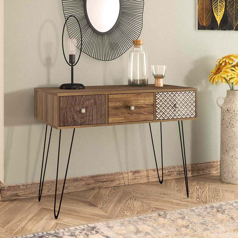 Toaletní stolek JonsiToaletní stolek s úložným prostorem Jonsi má moderní vzhled a je příjemným doplňkem do domácnosti. Je vyroben z vysoce kvalitní dřevotřískové desky odolné proti namáhání a opotřebení. Je stylový, poutavý a navíc praktický. Toaletní stolek nabízí velkorysý úložný prostor členěný na tři zásuvky. Zhotoven je v barvě ořechu a hnědé barvy s více geometrickými vzory. Má kovové černé nohy, které nábytek elegantně pozvednou a zvýrazní, zároveň nabízejí vynikající oporu.
