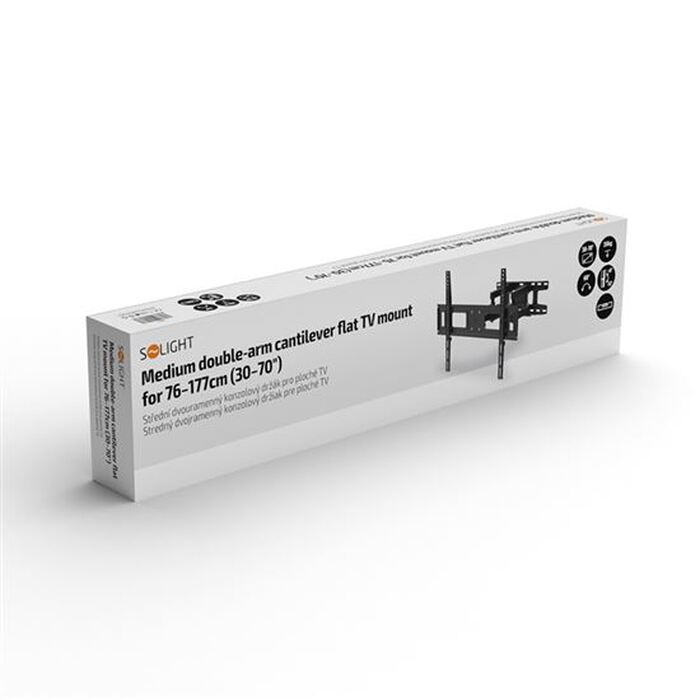 Jednoduchá inštalácia a systém dvoch ramienVďaka svojmu dvojramennému prevedeniu ponúka držiak bezpečné zavesenie TV aj pri maximálnej vzdialenosti od steny a súčasne uľahčuje manipuláciu s ňou. Držiak pre ploché TV je dodávaný s kompletnou inštalačnou sadou vrátane vodováhy, aby bola montáž čo najjednoduchšia a rýchlejšia. Vďaka maximálnej nosnosti držiaka až 35 kg máte istotu, že váš televízor bude v bezpečí. |