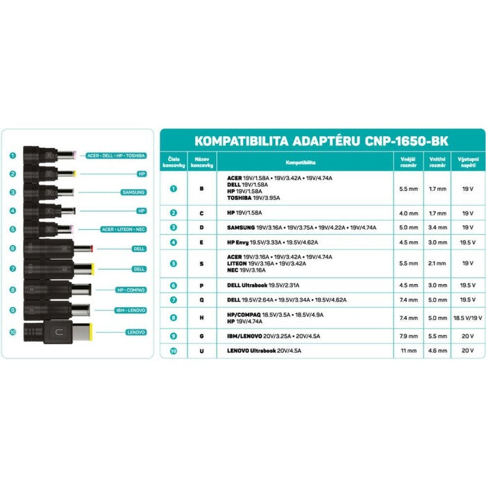 NTB adaptér 65W + extra USB portUniverzálny napájací adaptér pre notebooky rôznych značiek (Acer, Compaq, Dell, HP, IBM, Lenovo, Nec, Samsung, Toshiba). Adaptér je vybavený ochranami proti prepätiu, nadprúdu a skratu, ktoré bránia poškodeniu vášho notebooku alebo mobilného zariadenia. V rámci dvoch výstupov môžete nabíjať zároveň notebook a mobilný telefón. Ochranu kábla proti nežiadúcim VF rušením po celej jeho dĺžke chráni feritový valčekový filter. Jeho praktickosť s 10 vymeniteľnými koncovkami, ktoré sú súčasťou balenia, využijete na cestách, kedy vám bude stačiť zabaliť len jednu nabíjačku. |