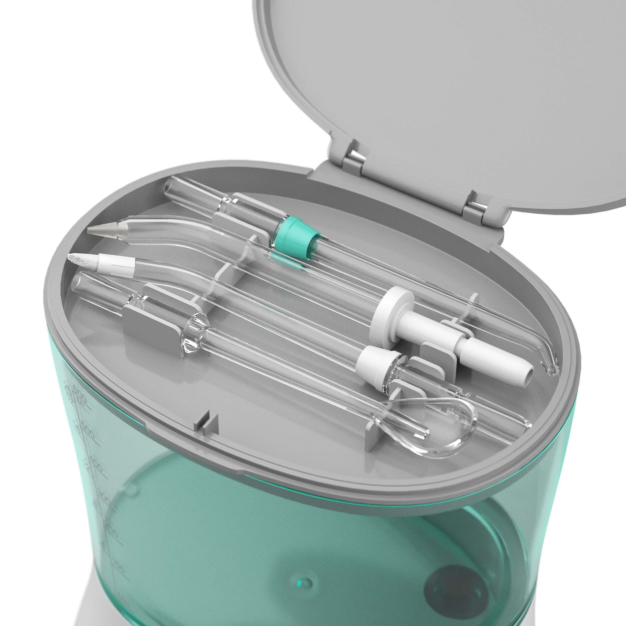 Výmeniteľné nástavceSúčasťou ústnej sprchy je bohaté príslušenstvo, ktoré vám zaistí zdravý a žiarivý úsmev. Celkom sú k dispozícii 4 rôzne druhy nástavcov pre rôzne potreby ústnej hygieny. Vďaka praktickému úložnému priestoru nachádzajúcemu sa priamo na podstavci ústnej sprchy ich budete mať stále poruke. Vodná nádržka ponúka kapacitu 600 ml a je vybavená praktickým vekom. Obsah balenia: • Hlavná jednotka: 1 ks |