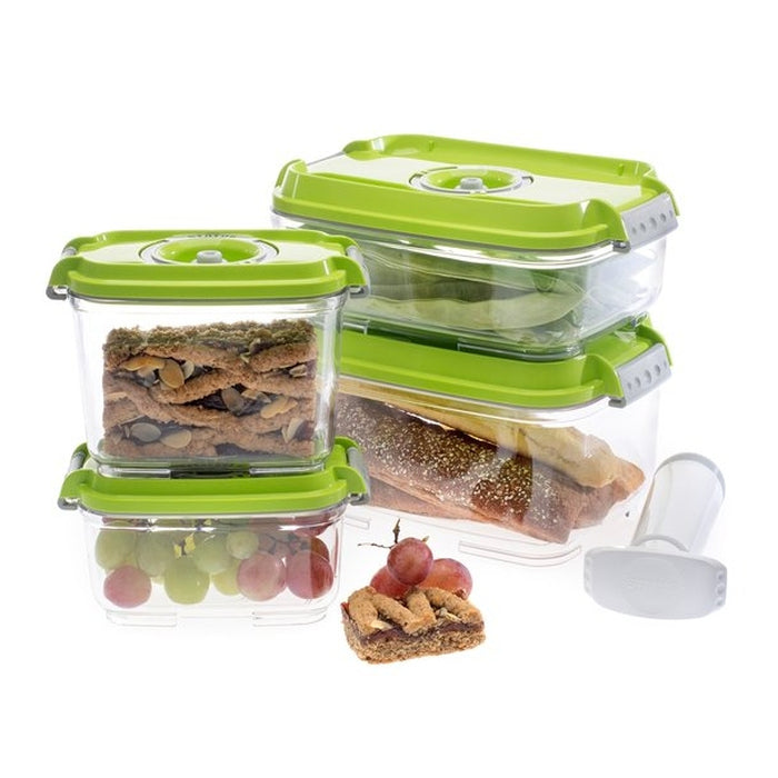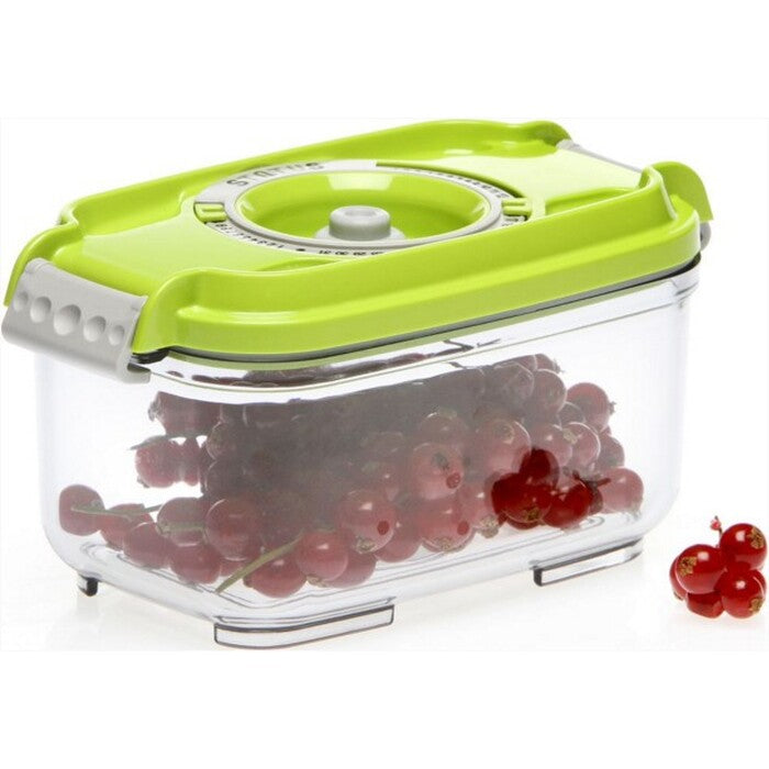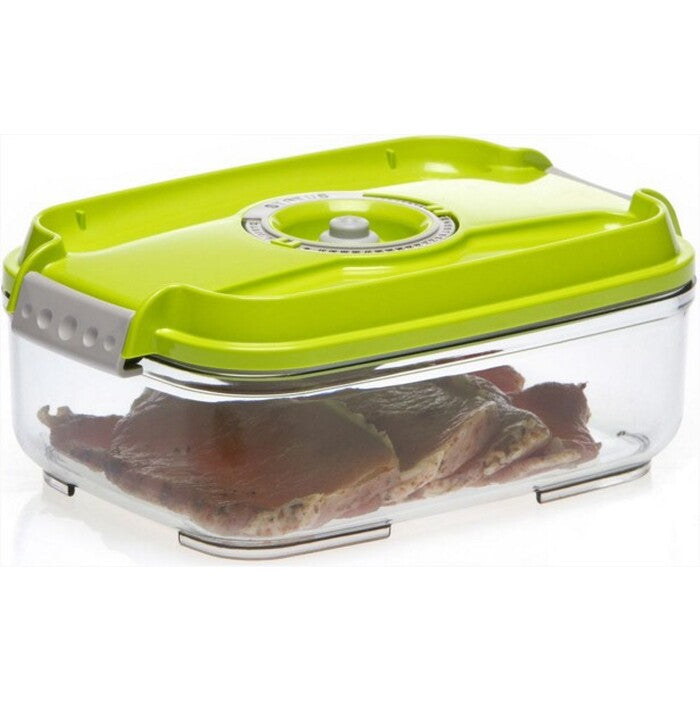 Vakubox predlžuje čerstvosť potravín a obdĺžnikový tvar zaisťuje dobré skladovanie. Vhodný je na uskladnenie všetkých druhov potravín: ovocia, zeleniny, korenia, mäsa i cestovín. Päťdielny set Status 157531 sa skladá zo 4 vakuboxov (s objemom 0,5 l, 0,8 l, 1,4 l, 2 l) a 1 vákuovej pumpy. Box je vyrobený z vysokokvalitného polykarbonátu, tesnenia a ventil sú vyrobené zo silikónu a ABS plastu. Pre jednoduchú údržbu môžete nádoby umývať v umývačke riadu. Rozmery: 2L – 24 x 16 x 12 cm 1,4L – 24 x 16 x 9 cm 0,8L – 16,5 x 9 x 11,5 cm 0,5L – 16,5 x 9 x 8,5 cm |